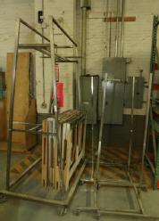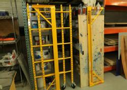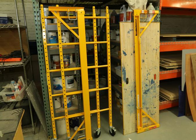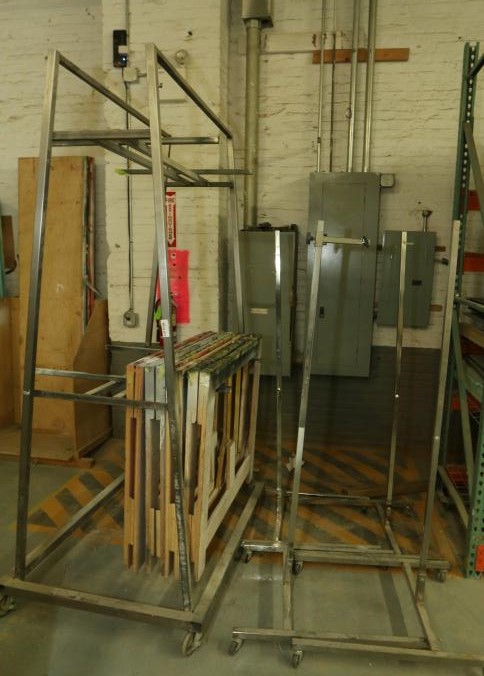 Metal Aframe rack for storage of materials and tools approx 55" x 36" x 96" tall, paper roll dispenser, metal and wood rolling work cart, and plywood rolling cart for storage of various materials. Including contents. Buyer must take all. Pickup can be completed on both days.