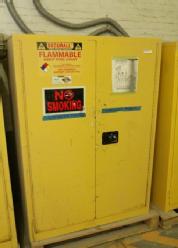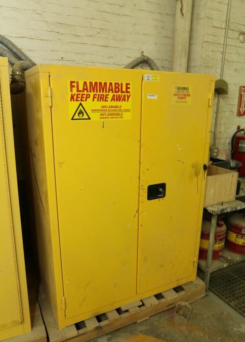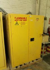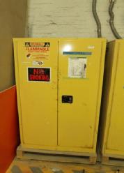FM approved 90 gallon capacity safety storage cabinet model BM90, 43" x 35" x 65" tall. Also includes contents. Buyer must take all. Pickup can be completed on both days.
