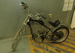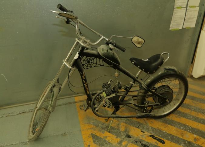 "The Azorian" moped bicycle with leather uph seat, wide rear tire and spoke rims. Unknown condition. No paperwork. Pickup can be completed on both days.