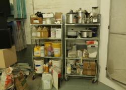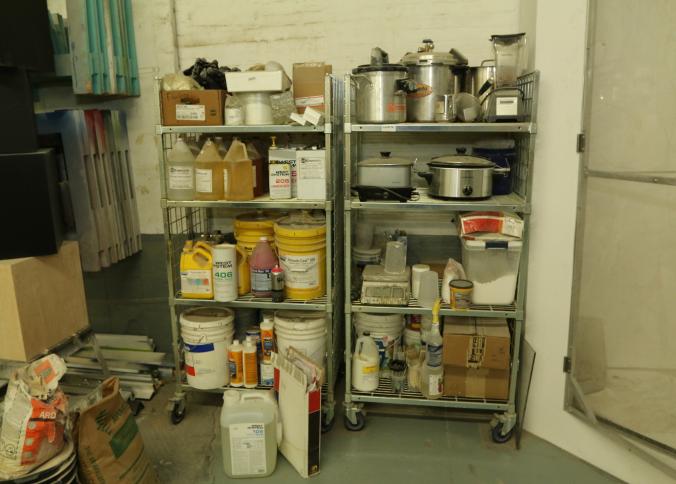 Sculpting equipment supplies and racks including luminescent paint, Pro-880, glue, floor finish, manikin, some sculpting foam pieces, Walnut shell media, Smooth-cast 300, Mold Max 30, scale, blender, crock pots, rolling shelving units, stationary racks, etc. Buyer must take all. Excluding other lots, and scaffolding. Pickup must be completed on Thursday, September 8 by 3PM.