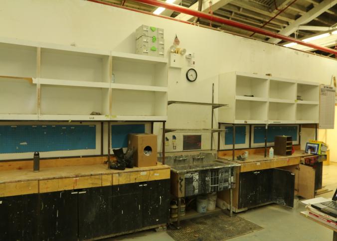 Work shop cabinets and stainless steel double bay sink. 11' x 25" x 101" tall, 54" wide sink and 9' cabinet set. Buyer must take all. Excluding contents and other lots. Buyer is responsible for proper and safe removal to the first disconnect including bringing the proper tools, equipment and help. Pickup must be completed by Friday, September 9 by 3PM.