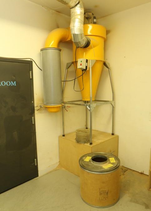The super dust gorilla dust collector model MS1-12D 28" x 28" x 90" tall, with ridged piping up to the flanges going to each machine. Buyer must take all. Pickup can be completed on both days.