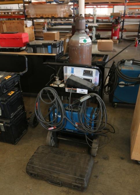 Miller Dynasty 200 TIG welder serial ME150340L, stock number 907099021 mounted to a rolling cart, also includes original box. Pickup can be completed on both days.