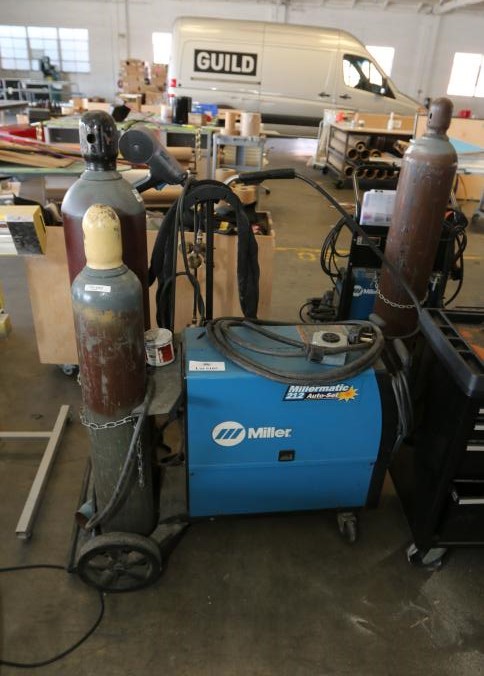 Millermatic 212 Auto-set wire welder with wire feeder and storage for two tanks. Tanks not included. Pickup can be completed on both days.