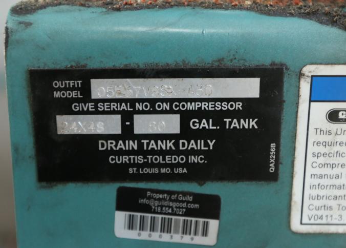 FS Curtis CA Series 80 gallon air compressor model 05E57VSSX-48D serial 24X4S. Pickup can be completed on both days.