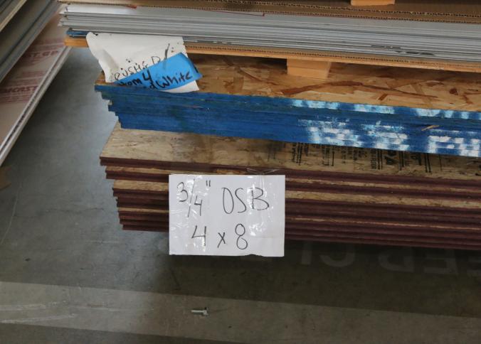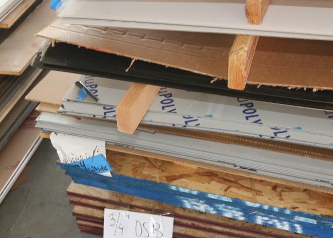 Stock including OSB, plywood, acrylic, 3/4" OSB, PVC board, Chemcast, Piedmont PSG plastics, etc. Buyer must take all. Pickup must be completed Thursday, September 15 by 3PM..
