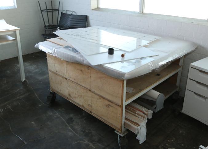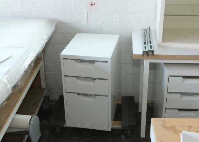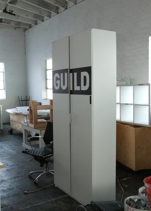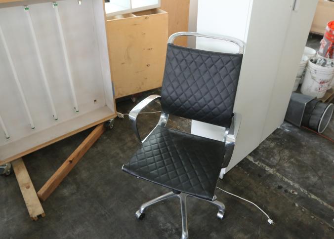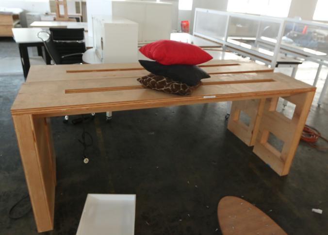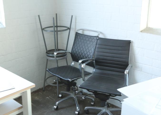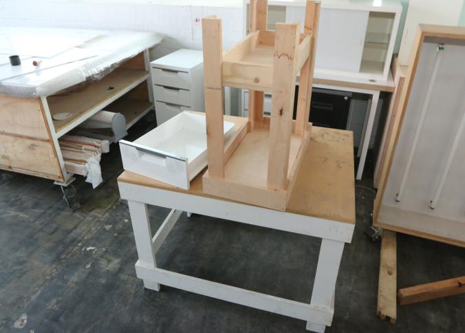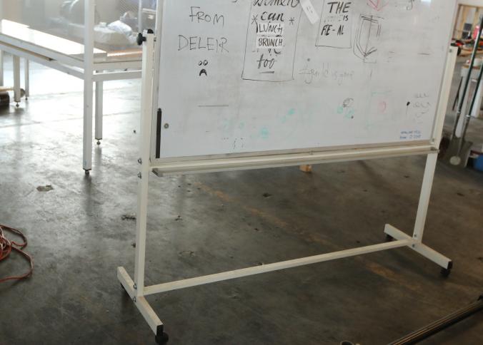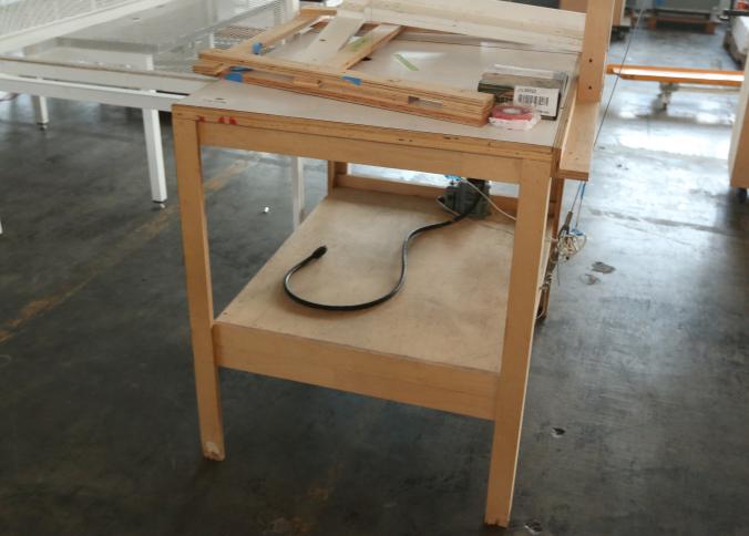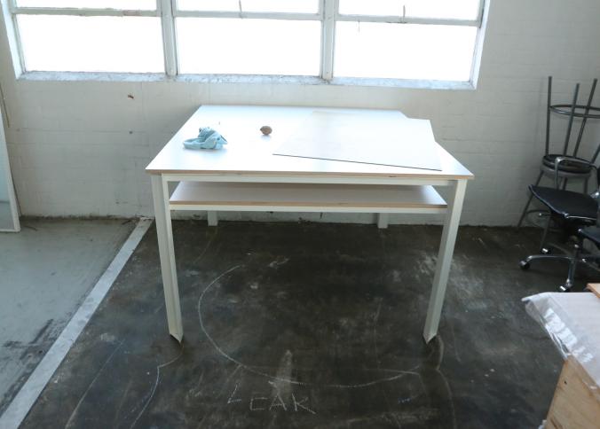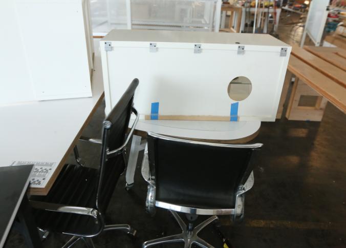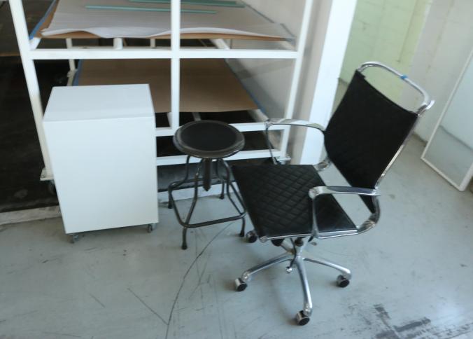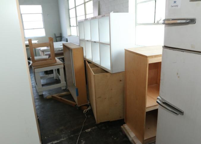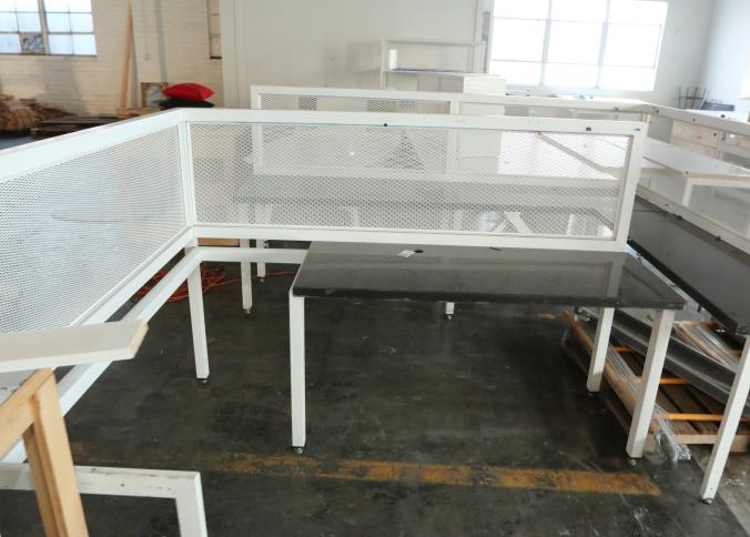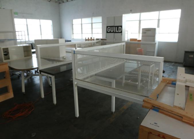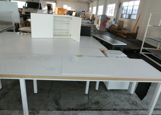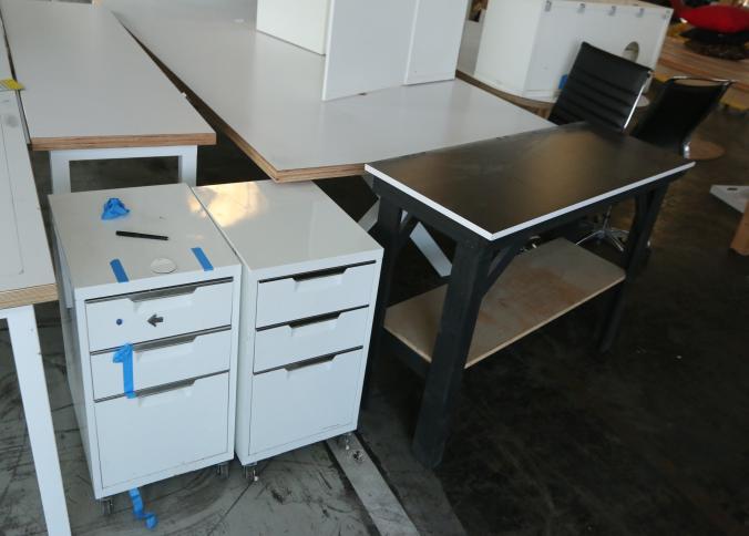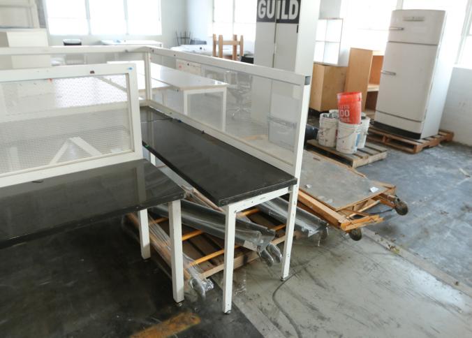Office furniture and assorted tables including custom wood prep tables, corner work stands with metal backsplash, two door locker, storage solutions, whiteboard top table, office chair, prep tables, etc. Buyer must take all. Pickup can be completed on both days.
