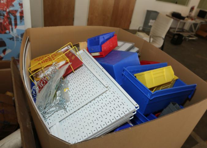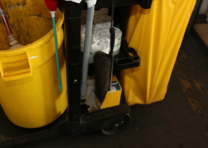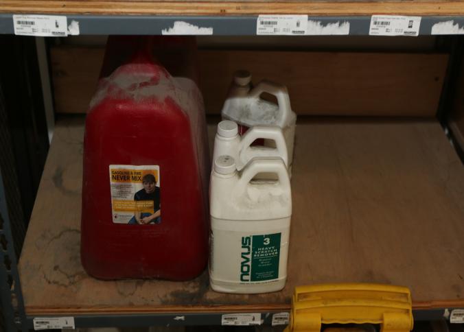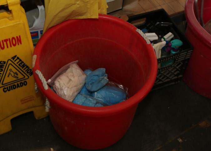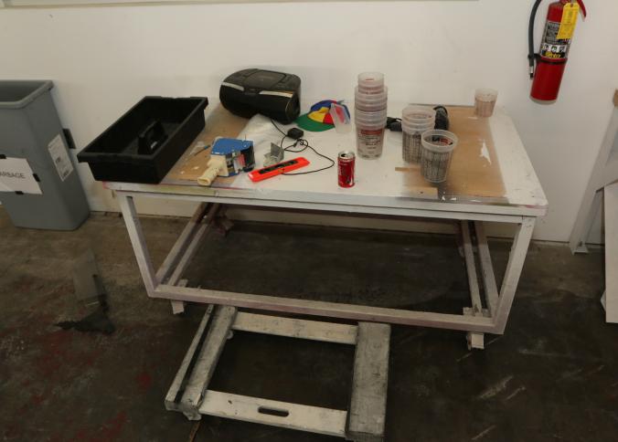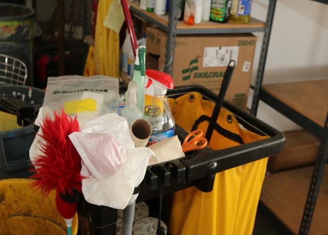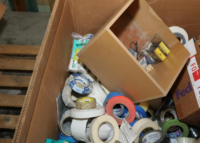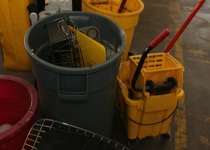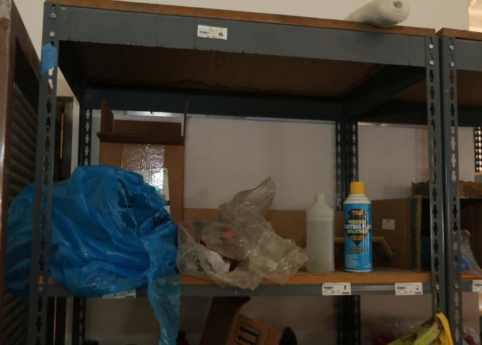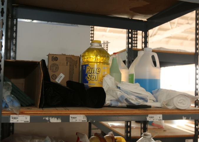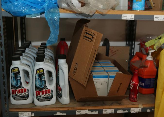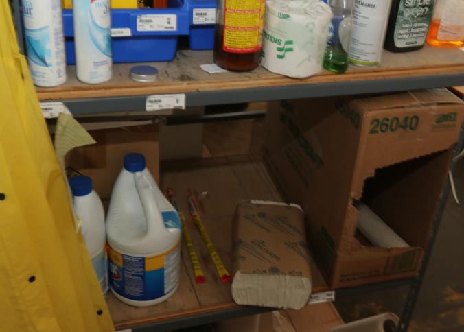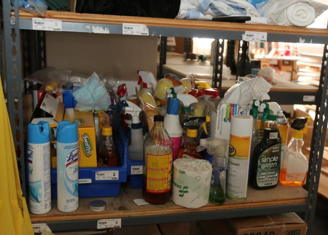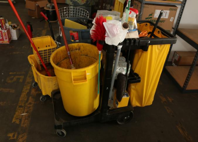 Cleaning supplies including mops, buckets, dust pans, spray cleaners, green sweep sweeping compound, garbage cans, light duty storage shelves, Drano, gas can, Clorox, Neutra Air, Pine Sol, tape, sprayers, prep tables 30.5"x96" and 48"x96", shop vacuum, plastic storage racks, etc. Buyer must take all. Pickup can be completed on both days.