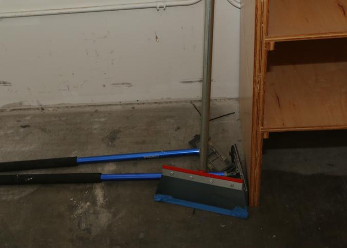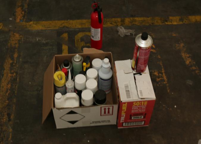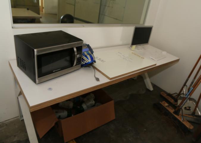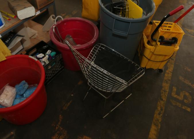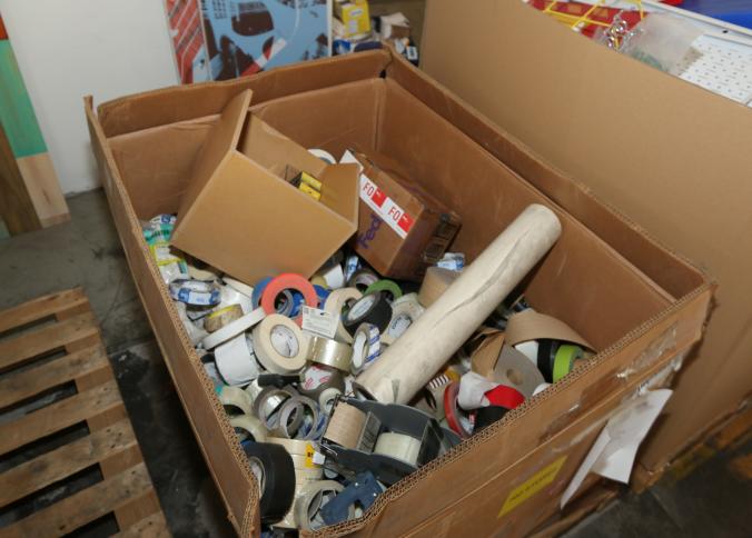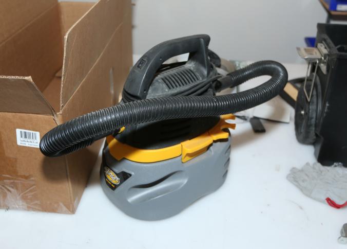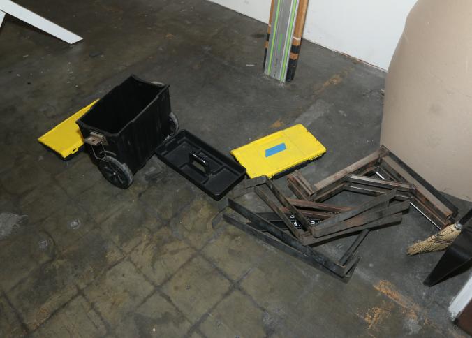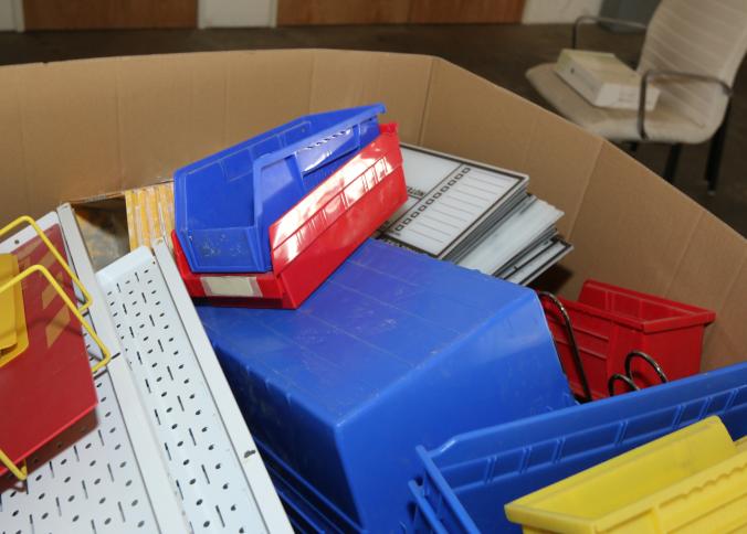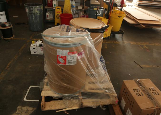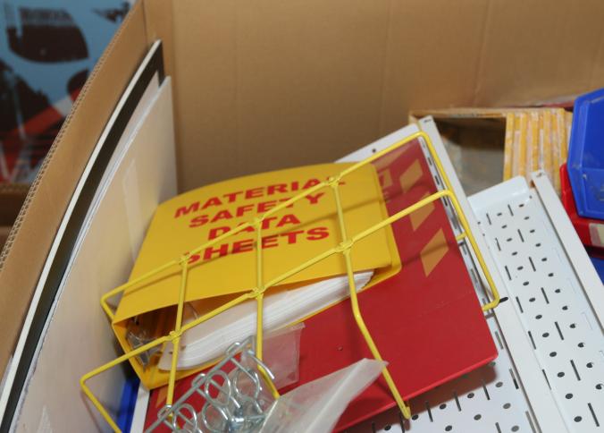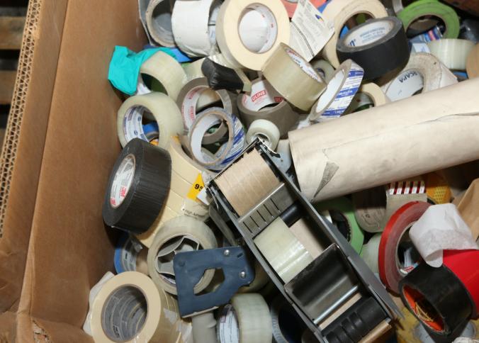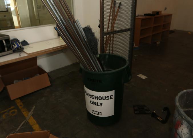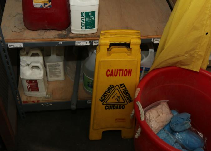 Cleaning supplies including mops, buckets, dust pans, spray cleaners, green sweep sweeping compound, garbage cans, light duty storage shelves, Drano, gas can, Clorox, Neutra Air, Pine Sol, tape, sprayers, prep tables 30.5"x96" and 48"x96", shop vacuum, plastic storage racks, etc. Buyer must take all. Pickup can be completed on both days.