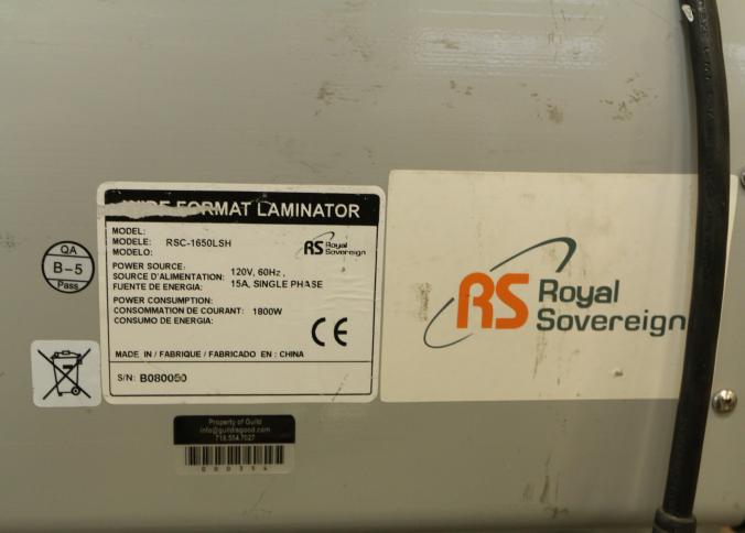 Royal Sovereign wide format laminator model RSC-1650LSH, serial number B080050. Approx 75.5" wide. Pickup can be completed on both days.