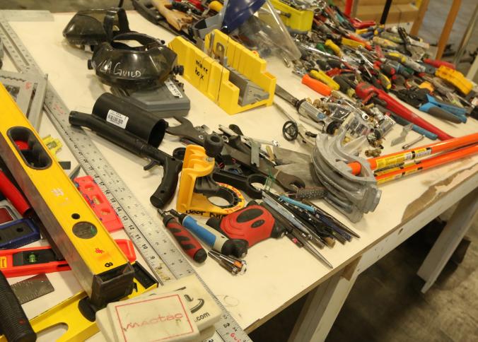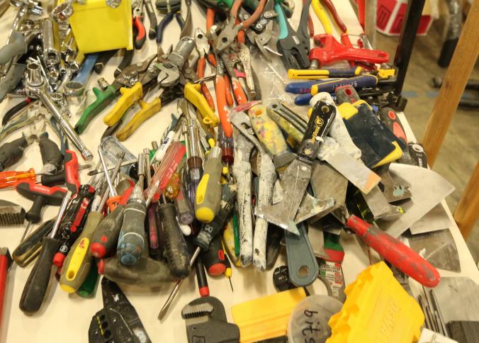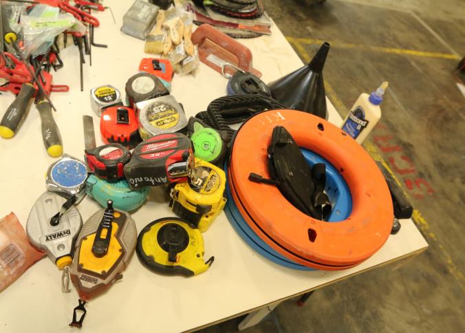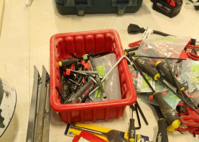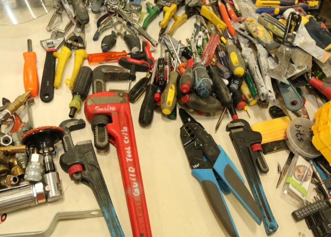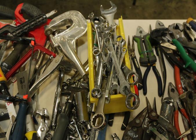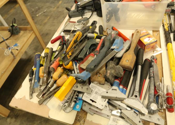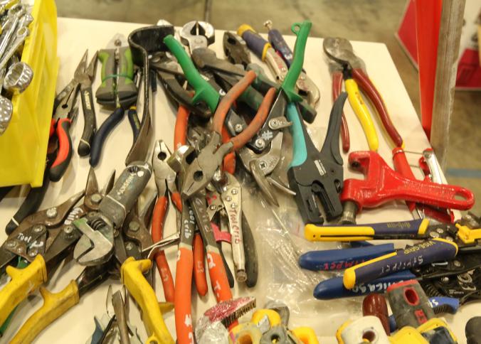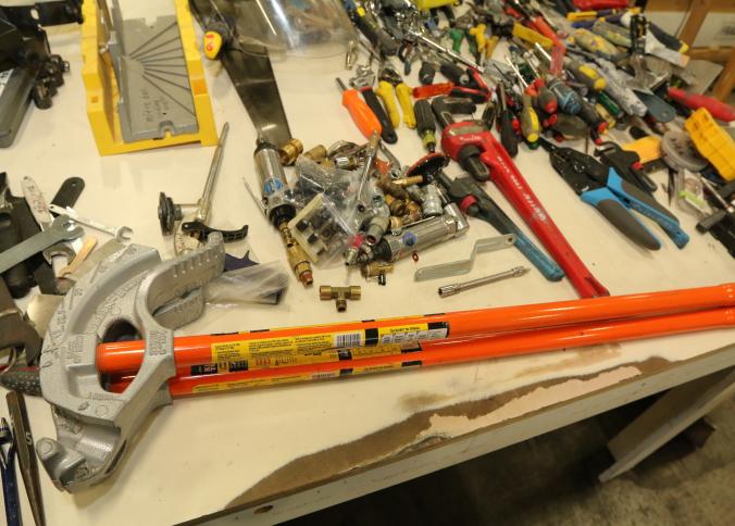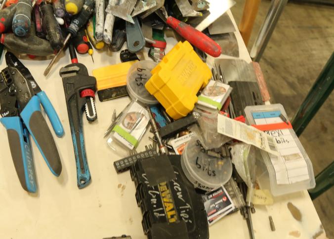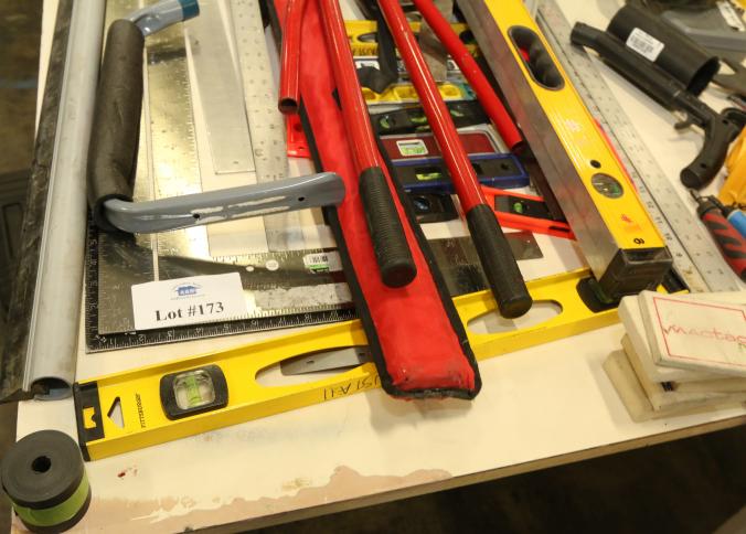 Hand tools including levels, bolt cutters, pipe benders, pipe wrench, wire strippers, screw drivers, ratchet, sockets, wrenches, pliers, needle nose pliers, adjustable wrench, tape measures, snake, drill bits, flat bar, glue guns, hole saws, caulk guns, files, saw blades, irons, etc. Buyer must take all. Pickup must be completed Thursday, September 15 by 3PM..