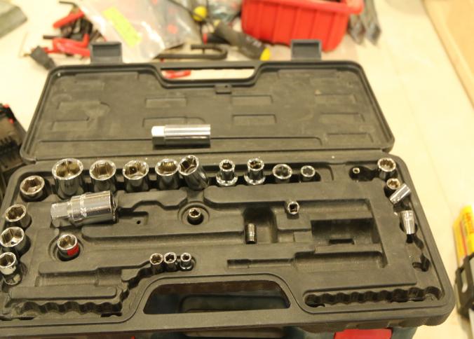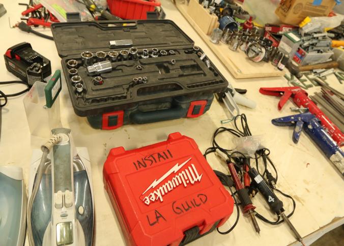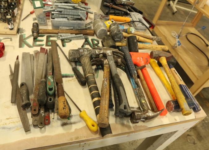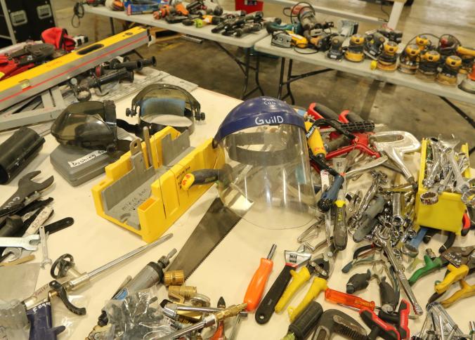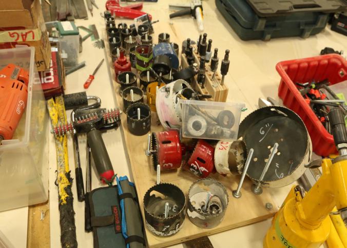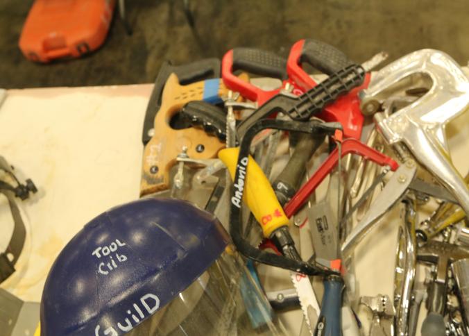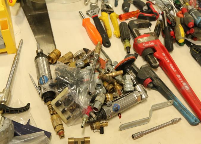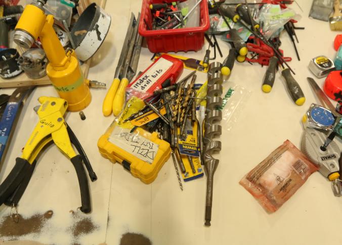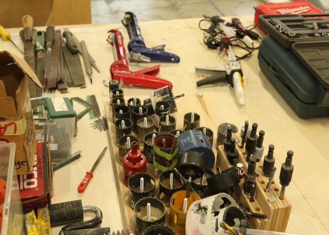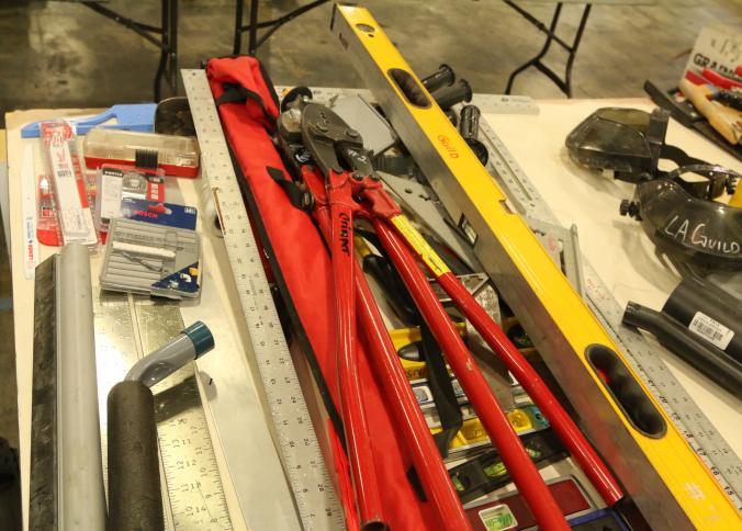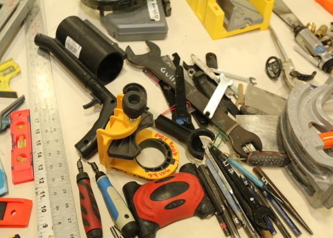 Hand tools including levels, bolt cutters, pipe benders, pipe wrench, wire strippers, screw drivers, ratchet, sockets, wrenches, pliers, needle nose pliers, adjustable wrench, tape measures, snake, drill bits, flat bar, glue guns, hole saws, caulk guns, files, saw blades, irons, etc. Buyer must take all. Pickup must be completed Thursday, September 15 by 3PM..