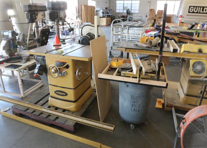 Powermatic model 2000 cabinet table saw stock number 1791997 with an attachable side table, adjustable fence, assorted blades, and adjustable roller. Already disassembled for easy removal. Pickup can be completed on both days.