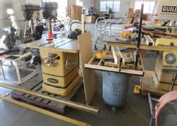 Powermatic model 2000 cabinet table saw stock number 1791997 with an attached side table, adjustable fence and adjustable roller. Pickup can be completed on both days.