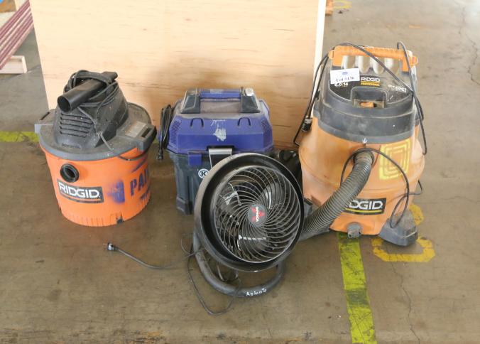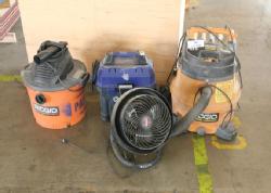 Ridgid 6 gallon shop vac, Kobalt 5 gallon shop vac and Ridgid 14 gallon professional shop vac on caster, also includes one electric fan. Buyer must take all. Pickup can be completed on both days.