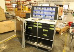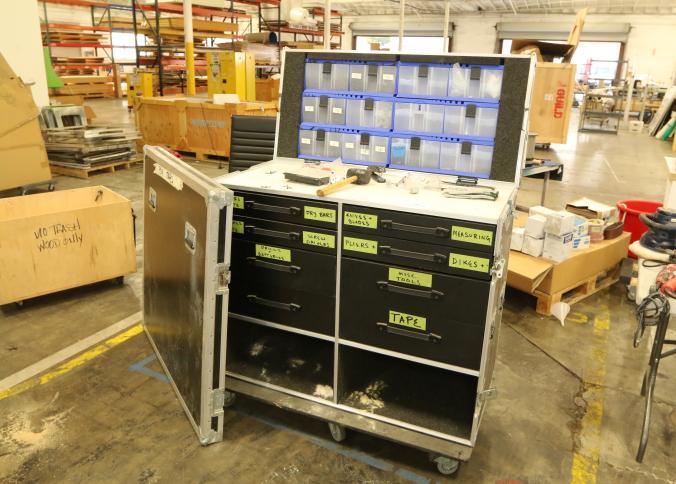 Custom portable tool box travel case on casters with flip top and eight interior drawers, also includes the contents. 49"x22"x48". Pickup can be completed on both days.
