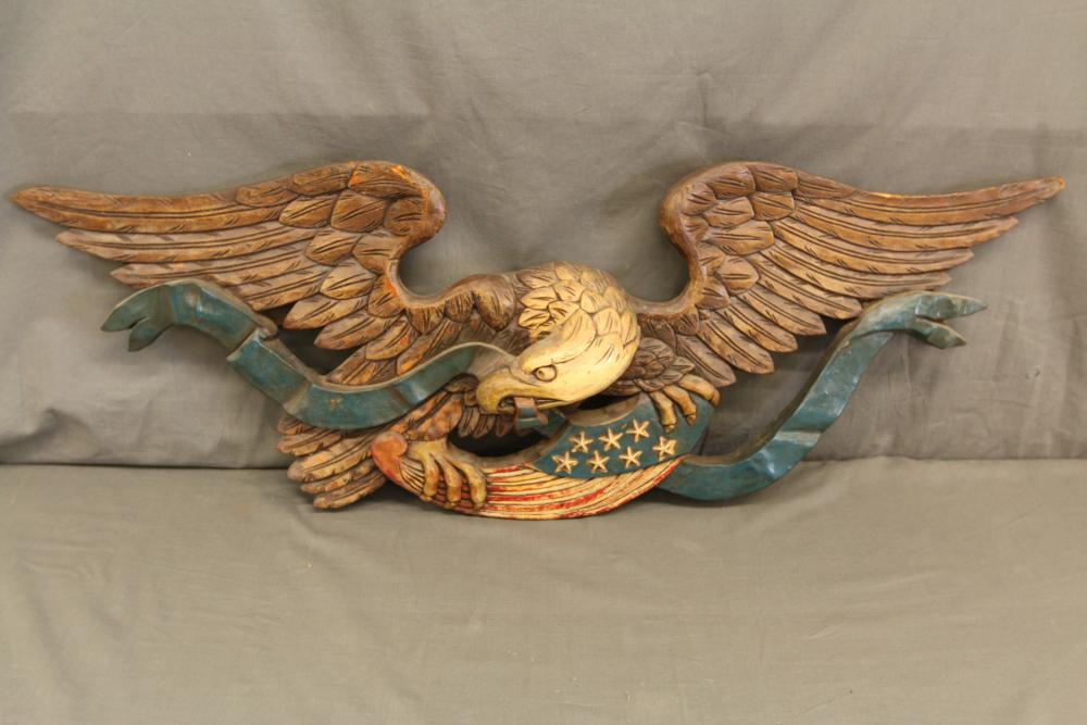 Carved wooden wall hanging of bald eagle having American flag clenched in talons, approx 46" x 17".