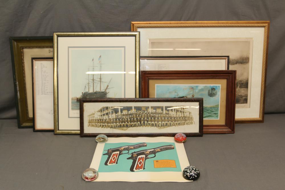 Framed prints incl "U.S.Battleship "Maine", "Battery "B" Third Field Artillery U.S. Army Feby 1915", "naval scene pencil signed lower right illegible, signed in print appearing to read "A.R. Dugi** 1898", 1899-1901 class photo, ship scene marked at bottom "The Last Journey of "Victory", 1922.", assembly diagram of "Replica "Brown Bess" Long Land Pattern British Military Muskey", and exploded diagram of "Replica "Brown Bess" Long Land Pattern British Military Musket", etc largest being 36.25" X 27.5". Paper weights not included.