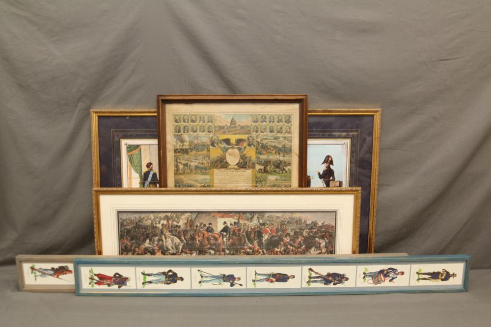 Framed artwork incl two prints titled "Officers Generaux" and "Artilleurs", print of post battle scene with officers on horses and people wearing red coats, "G.A.R. & War Record" marked on lower left "Entered According to Act of Congress in the Year 1888 by J.M. Vickroy, In the Office of the Librarian of Congress at Washington D.C." marked lower right "Published by J. M. Vickroy & Co Terre Haute, Indiana", Frederick Remington military personnel prints incl "Federal Zouave U.S.A.", "Calvaryman U.S.A.", "Artilleryman U.S.A.", "Infantry Officer U.S.A.", "Infantryman U.S.A.", "Drummer U.S.A.", "General Officer U.S.A.", "Confederate Zouave C.S.A.", "Calvaryman C.S.A.", "Artilleryman C.S.A.", "Infantry Officer C.S.A.", "Infantryman C.S.A.", "General of Cavalry C.S.A.", and "General Officer C.S.A." all marked lower right "FR", two being 6" x 61", largest being 23.5" x 30.5".