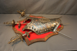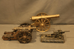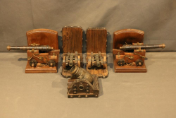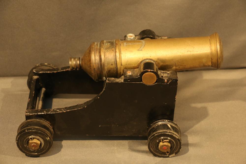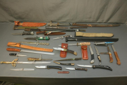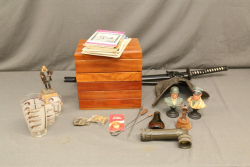 Items include Deutsches Rotes Kereuz (DRK) subordinate's hewer; WWI U.S. 1917 trench knife knuckle duster; Moroccan sword scimitar; French Yataghan sword bayonet; Buffalo Bill Bowie knife; Inox boot knives in sheaths; Spanish Cavalry Officer's sword; Japanese Gunto sword in scabbard; decorative hanging chest armor with crest; fencing swords; miniature cannons; Chelsea Clock Co. U.S. Army clock; Harvard Lock Company cast iron bell; Nylglo 100% nylon Coast guard flag on flagpole; military literature; military clothing camouflages, hat, belts; U.S. Navy MK1 spyglass; metal ammo can and more. Items located in Pleasant Valley, NY.