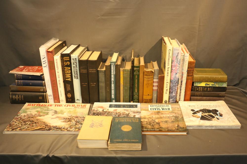 Military literature incl "U.S. Army A Complete History" by The Army Historical Foundation, "The Navy" by Naval Historical Foundation, "The Common Soldiers in the Civil War" by Bell Irvin Wiley, "Warships of the World" by Galuppini, "American Rifleman Vol 99 (1951) & 100 (1952)", "Tactics and Technique of Infantry Advanced", "Life of Washington 1 and 2" by Washington Irving, "Weapons & Warfare of the 20th Century", "The Growth of the American Republic" by Morison Commager, "Naval History of the United States Vol I and II", "The Naval Academy Illustrated History of the United States Navy" by Potter, "Bill Mauldin's Army", "The Confederate Soldier in the Civil War", "The Fighting Men of the Civil War" and "The Commanders of the Civil War" by Gallery Books, "The American Civil War", "Reminiscences of the Civil War" by General John B. Gordon, "Harper's Pictorial History of The Civil War", "The Day Lincoln Was Shot" by Bishop, "Mr. Lincoln's Army" by Bruce Catton, "Abraham Lincoln" by Nicolay, "The Generals of the Civil War", "Battlefields of the Civil War" by John Bowen, "Don Troiani's Civil War", etc, approx 40 books in total.
