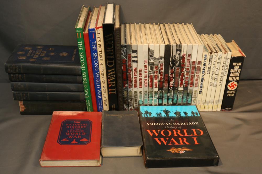 Military literature incl "History of the World War" by Frank H. Simmons Vol 2-5, Time Life Books World War II books incl "Blitzkrieg" "The Battle of Britain" "The Rising Sun" "The Home Front: U.S.A." "The War in the Desert" "The Italian Campaign" "The Battle of the Atlantic" "Return to the Philippines" "China-Burma-India" "The Second Front" "Liberation" "Island Fighting" "Russia Blesieged" and "Partisans and Guerrillas", National Geographic Society books incl "The Civil War" "Trails West" "Into the Wilderness" "Our Country's Presidents" "The Revolutionary War" and "America's Beginnings", "The Life and Death of Adolf Hitler" by Robert Payne, "The American Heritage History of World War I", "Pictoral History of the Second World War", "The Bluejackets' Manual 1943", etc.