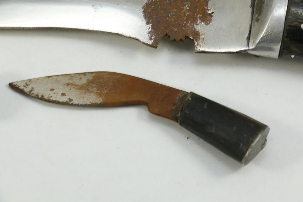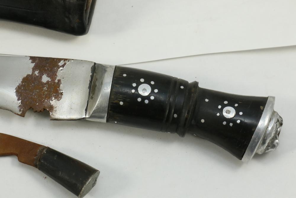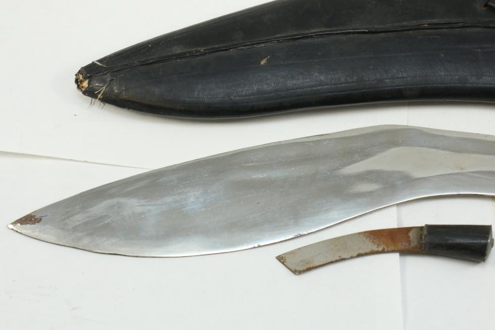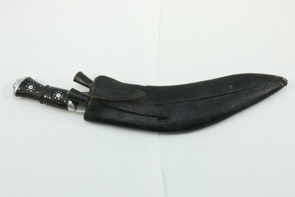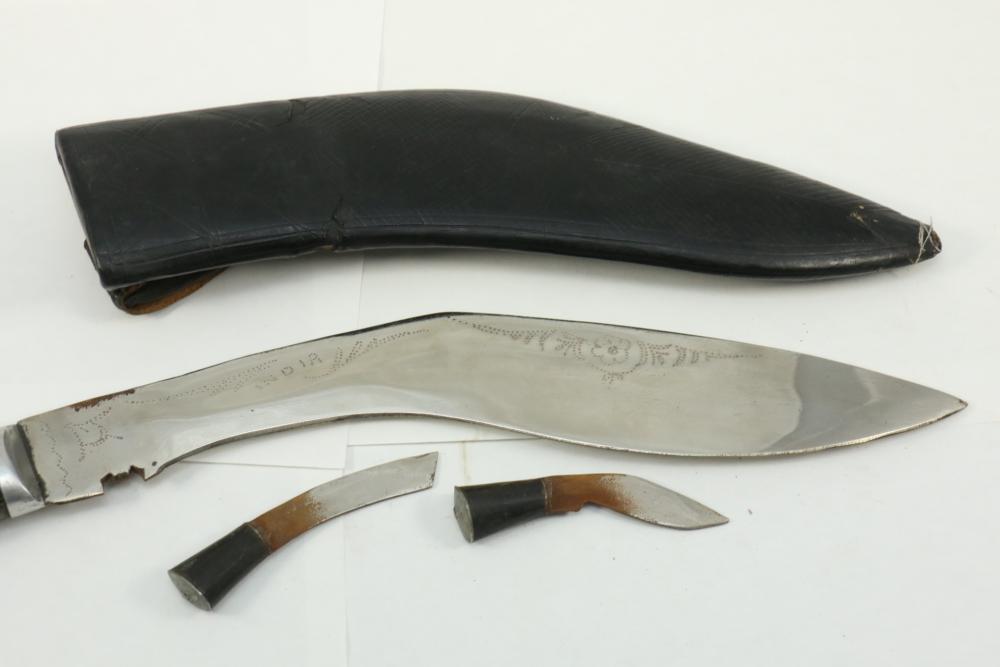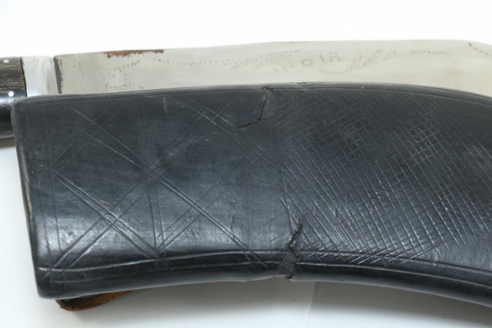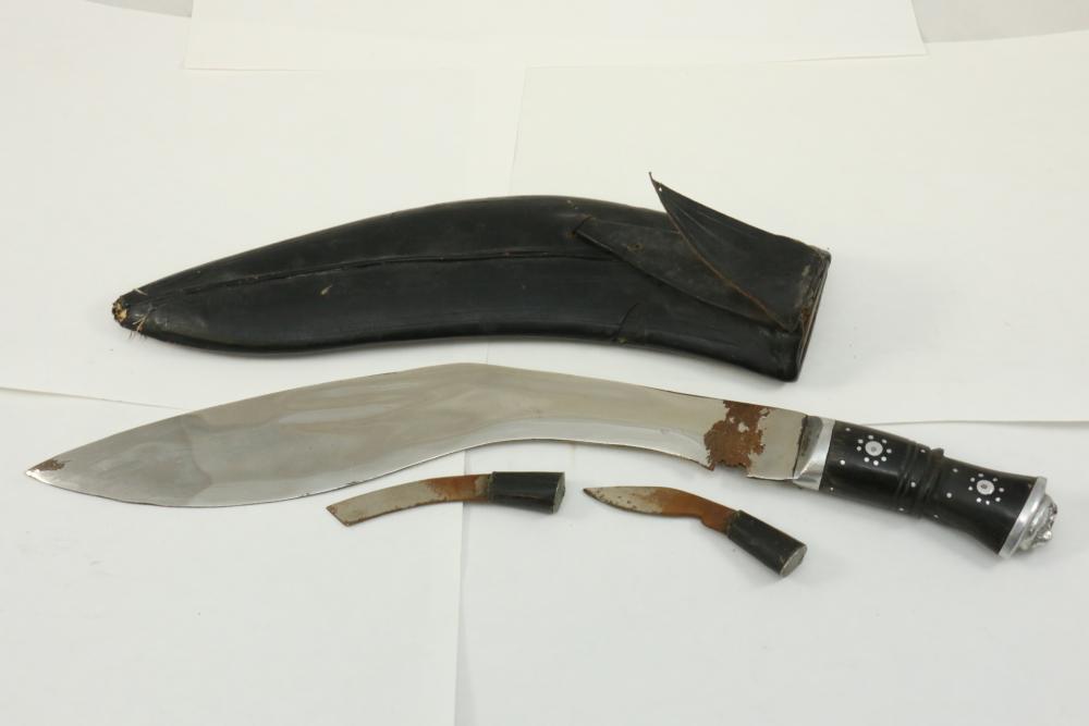 Nepalese Gurkha Kukri knife marked at base of blade appearing to be "WDM", with believed to be horn handle, leather sheath holds two additional smaller knives both having curved blades, knife without sheath measuring approx 15.75"L, and both smaller knives approx 3.5"L.