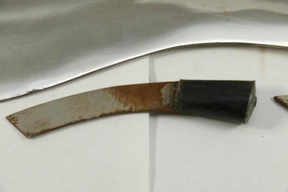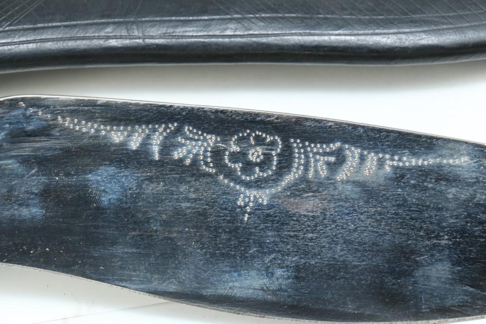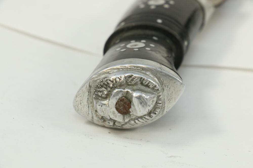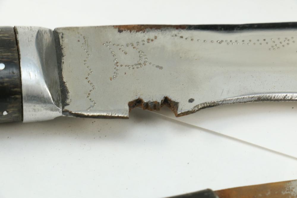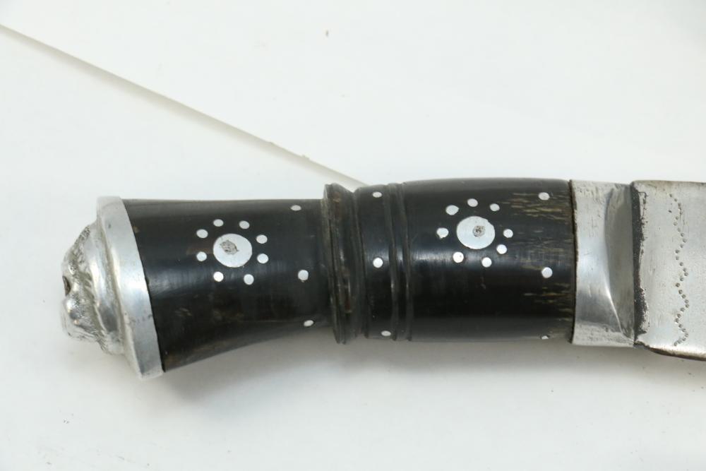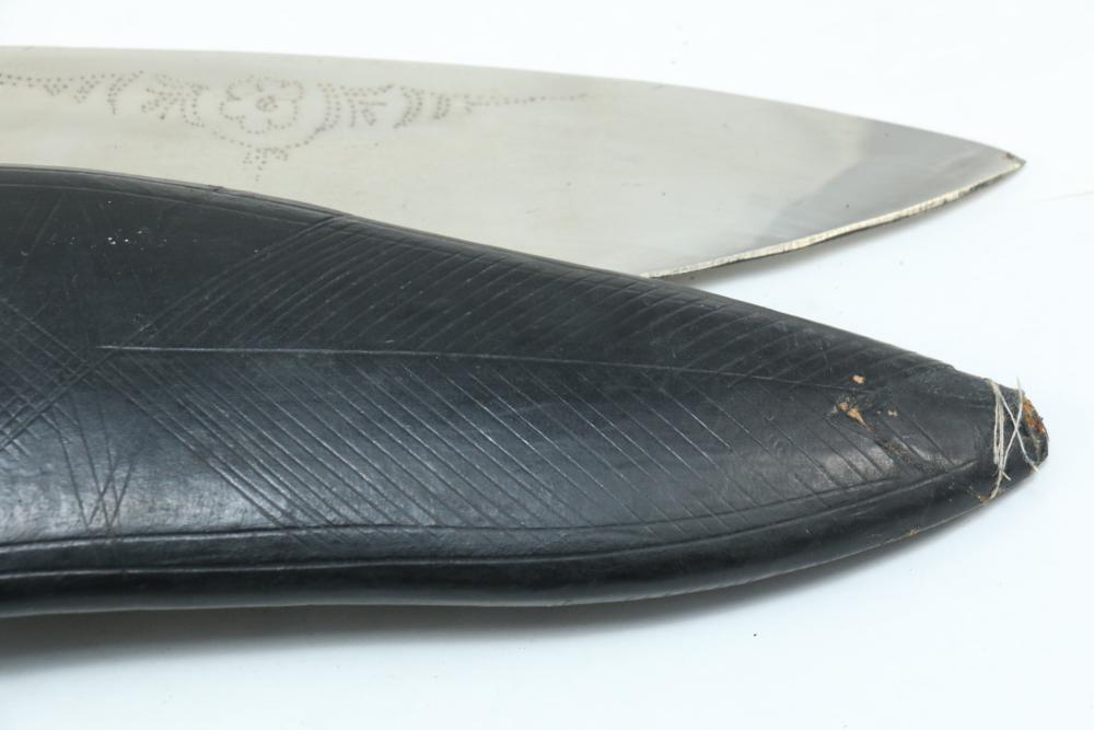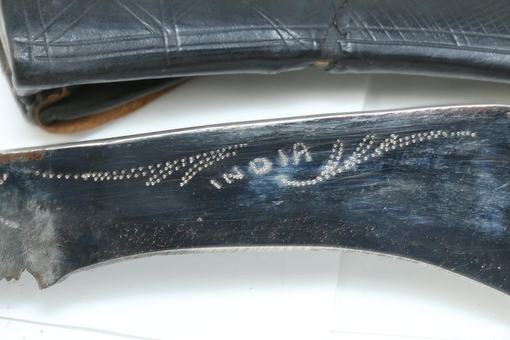 Nepalese Gurkha Kukri knife marked at base of blade appearing to be "WDM", with believed to be horn handle, leather sheath holds two additional smaller knives both having curved blades, knife without sheath measuring approx 15.75"L, and both smaller knives approx 3.5"L.