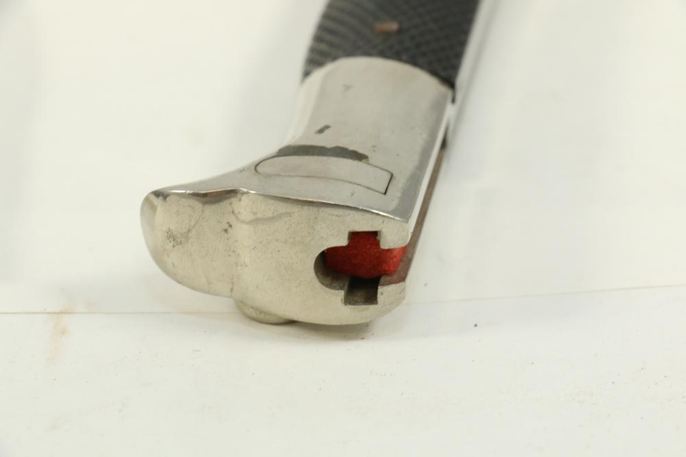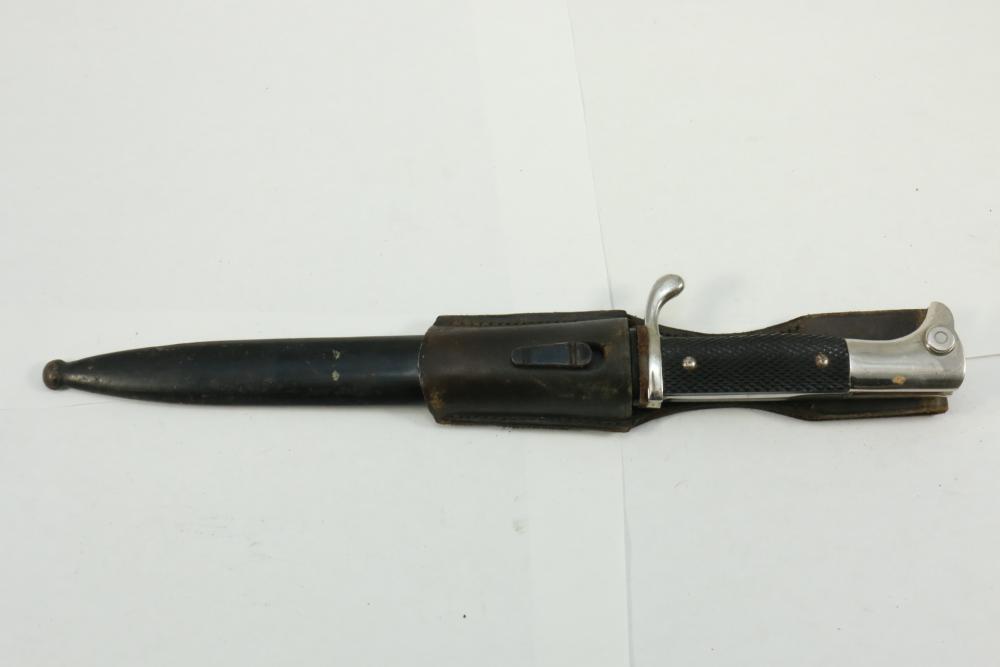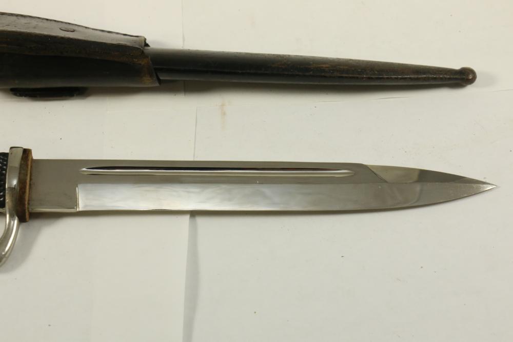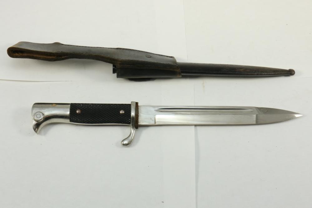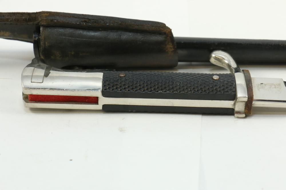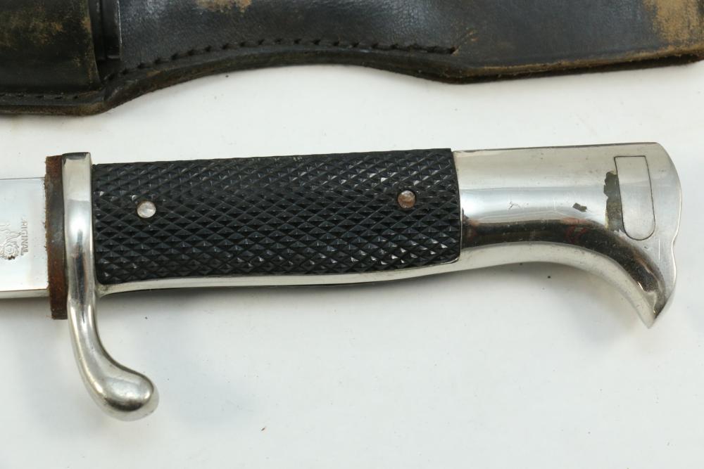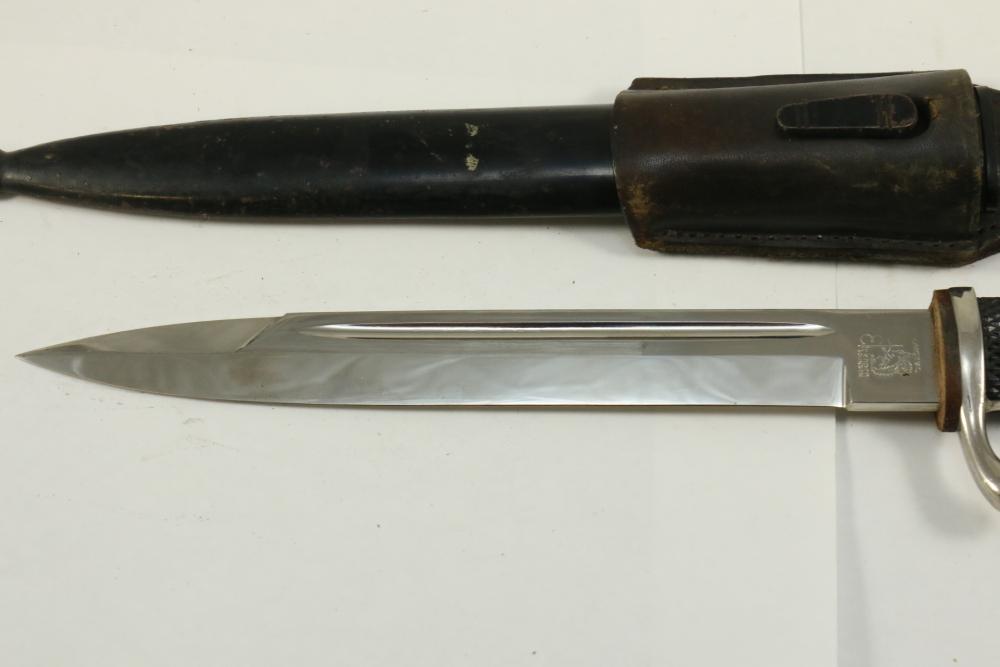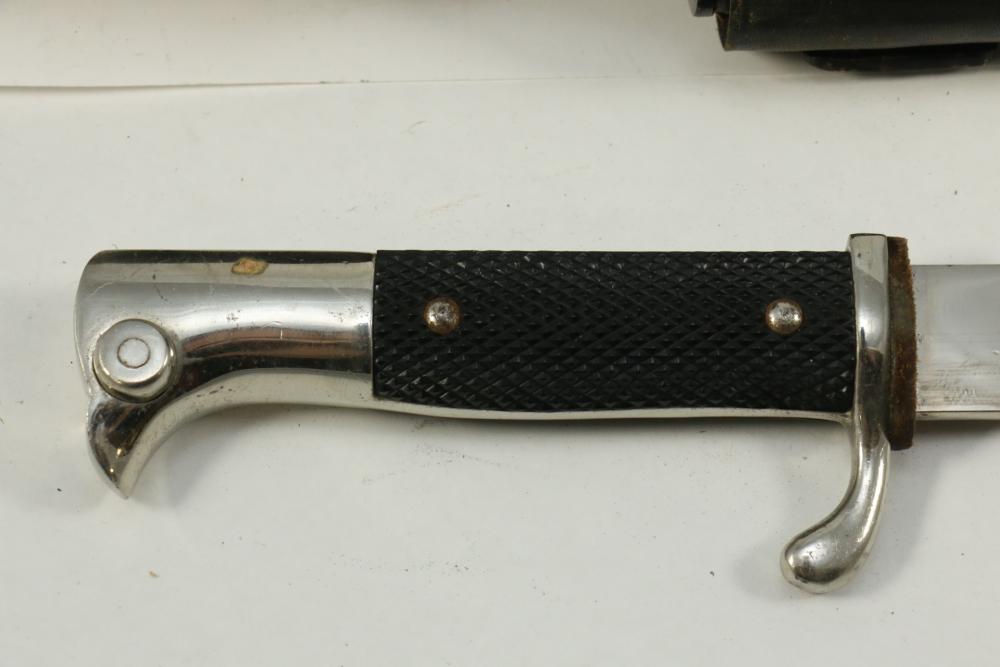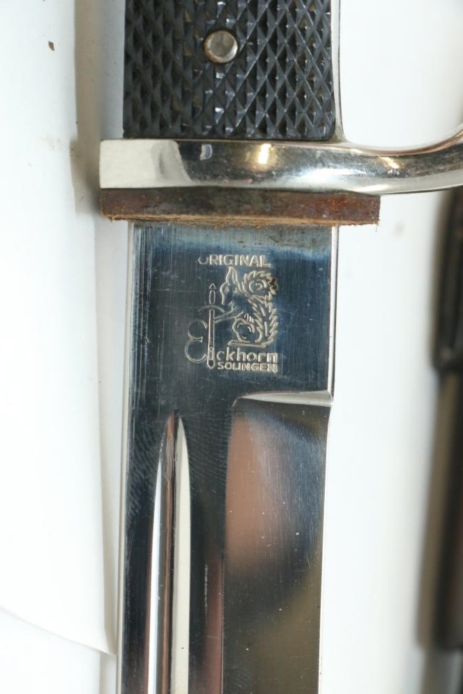 German Luftwaffe dress bayonet in scabbard with hanger, having plastic checkered pattern grip, "eagle" shaped pommel, marked at base of blade "Original Eickhorn Solingen", length of bayonet without scabbard 12.5"L.