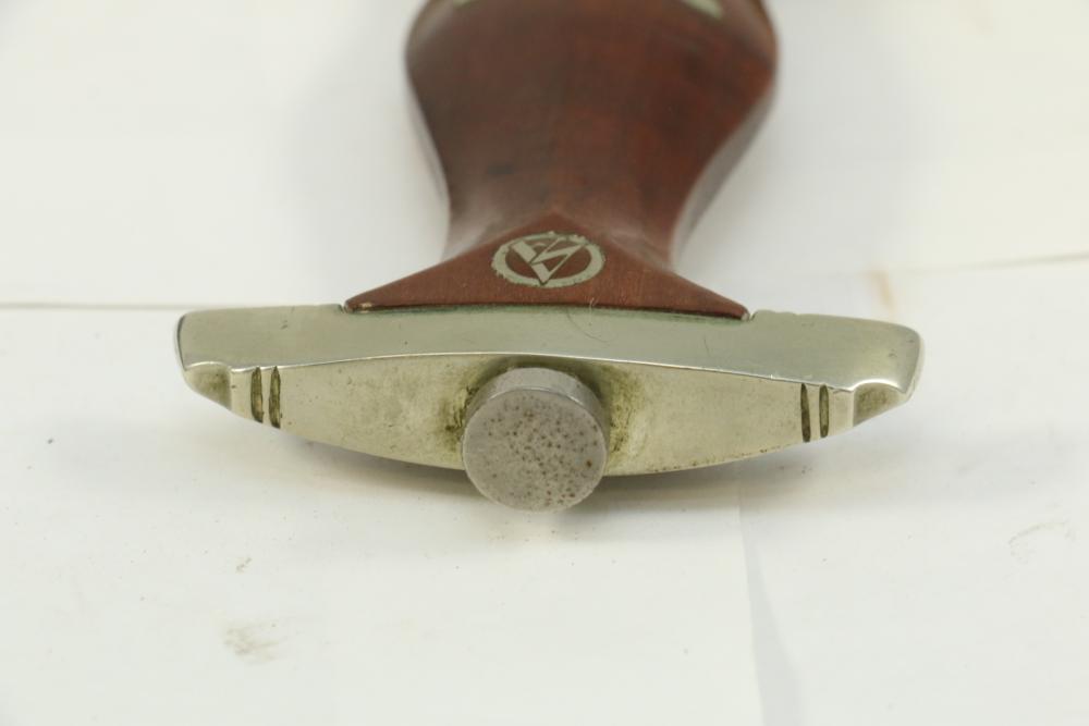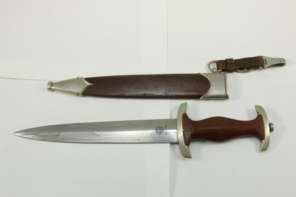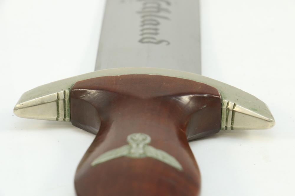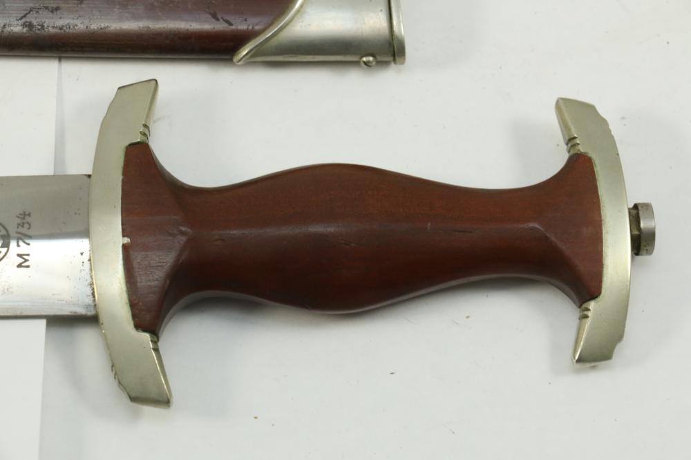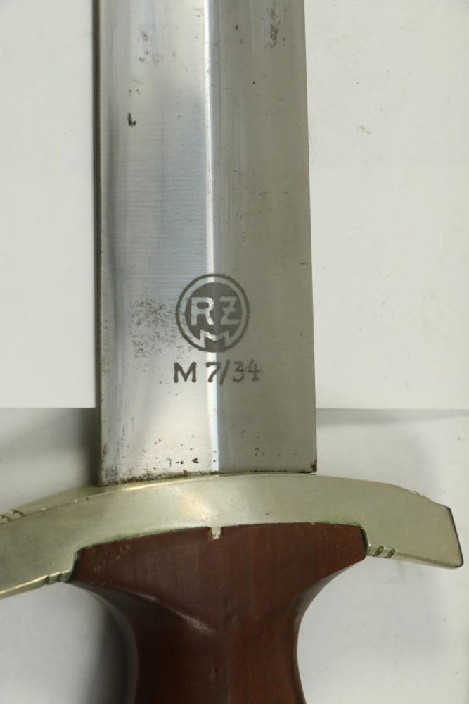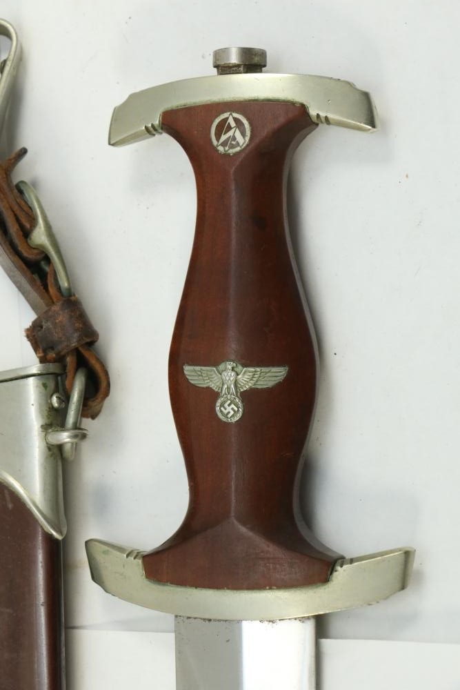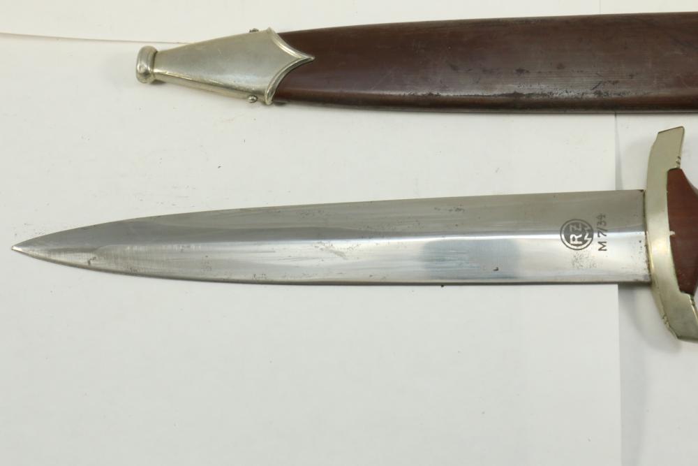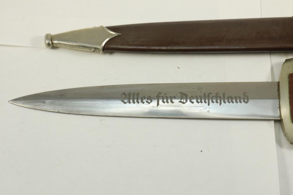 German SA dagger with brown wooden handle and brown matching scabbard, blade marked "Alles Fur Deutschland"(Everything For Germany) "RZM M7/34", dagger without sheath measuring 13.5"L.