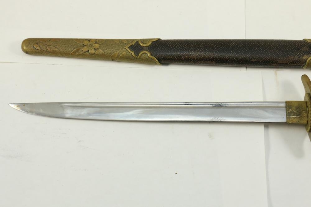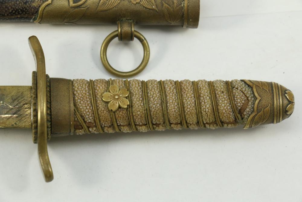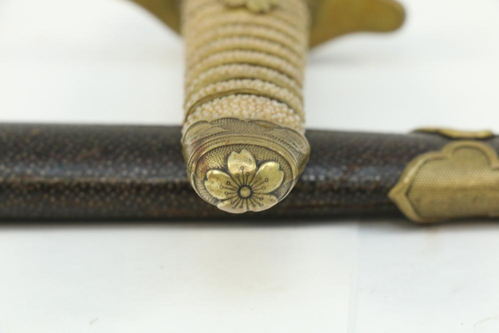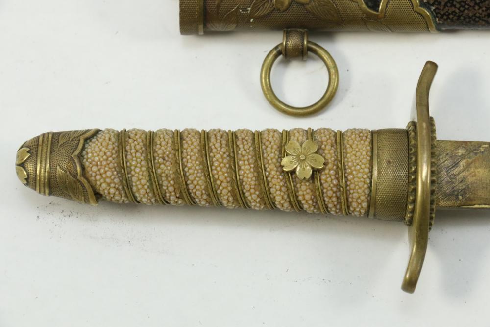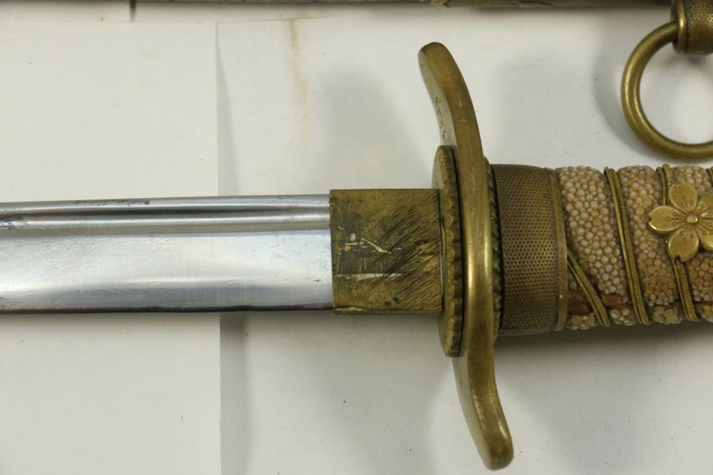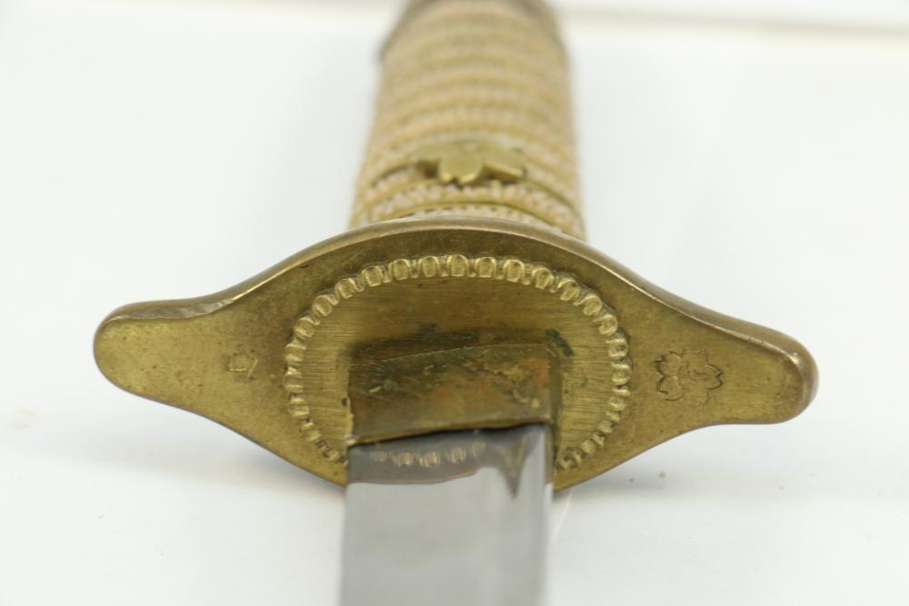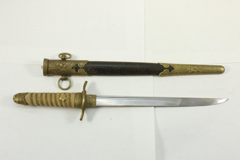 Imperial Japanese Naval Officer Dirk, handle with believed to be white pebbled ray skin with two wire wraps (below ferrule having a third wire broken off), cross guard marked with an anchor in center of cherry blossom, blade measuring approx 8.25", wood based scabbard believed to be wrapped in polished shark skin.