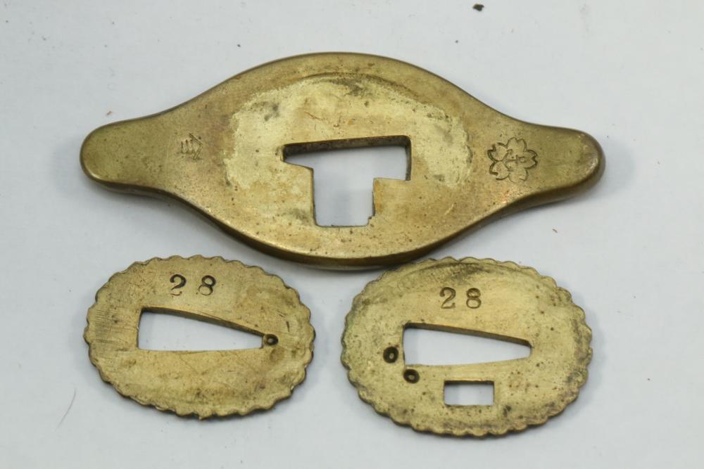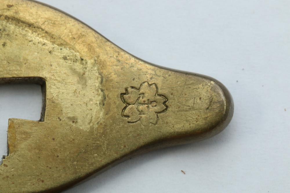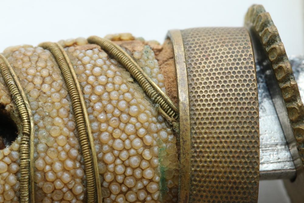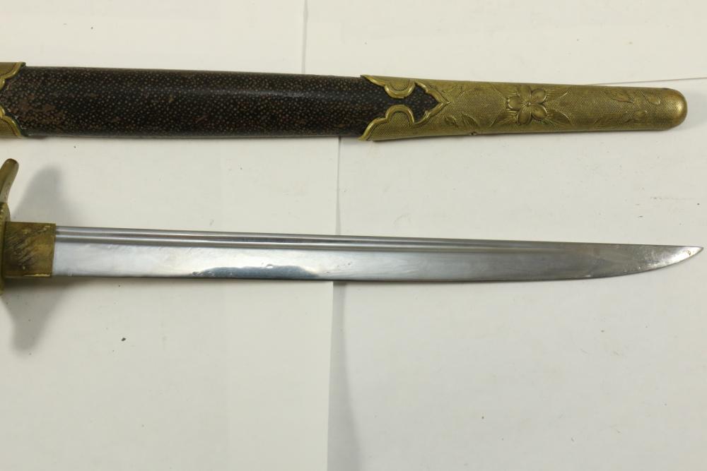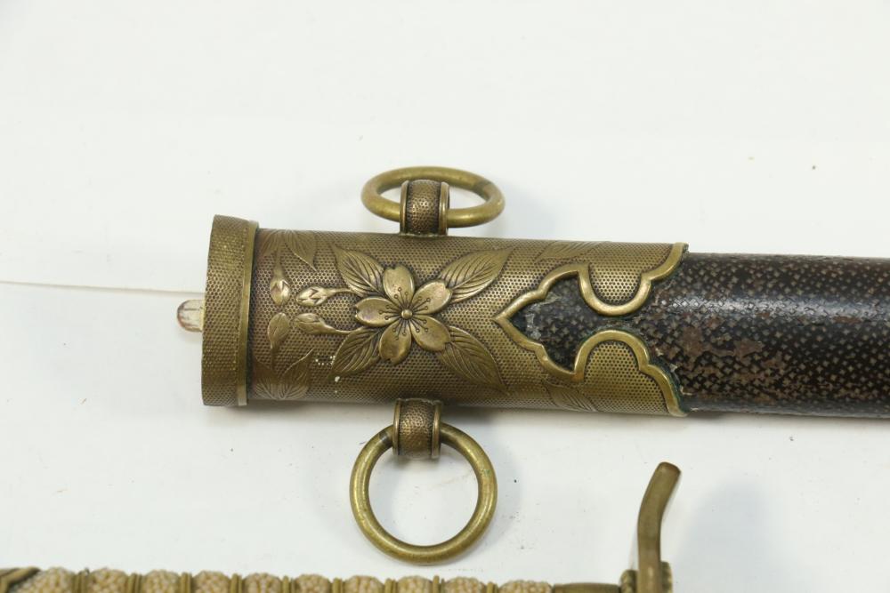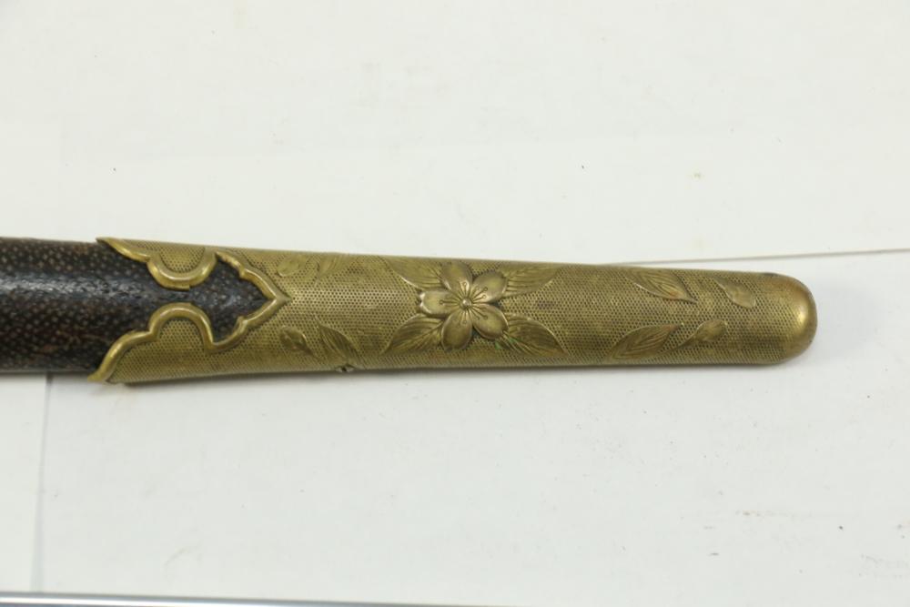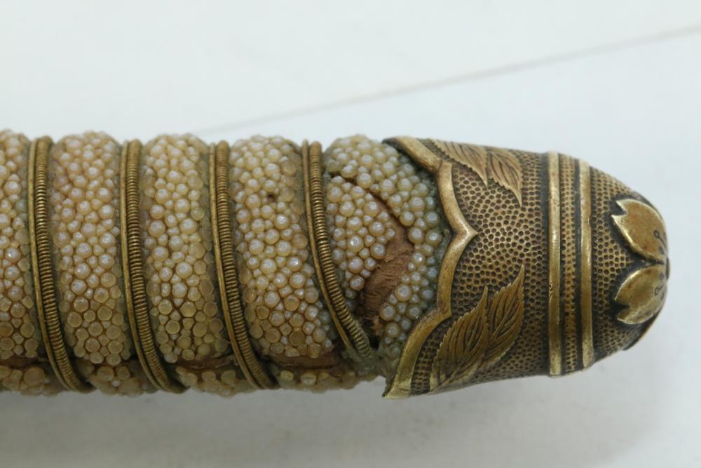 Imperial Japanese Naval Officer Dirk, handle with believed to be white pebbled ray skin with two wire wraps (below ferrule having a third wire broken off), cross guard marked with an anchor in center of cherry blossom, blade measuring approx 8.25", wood based scabbard believed to be wrapped in polished shark skin.