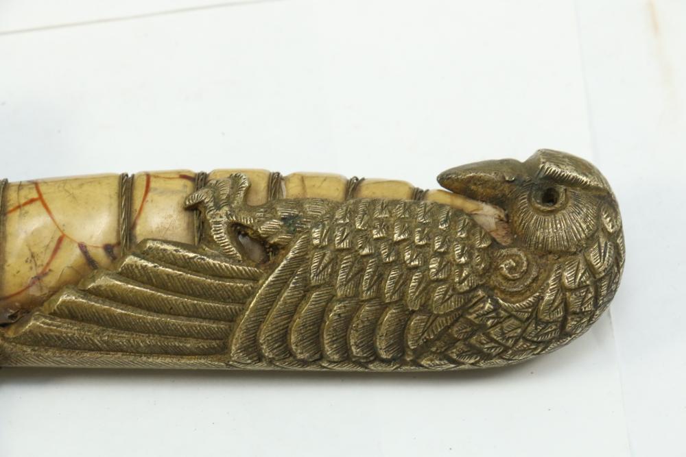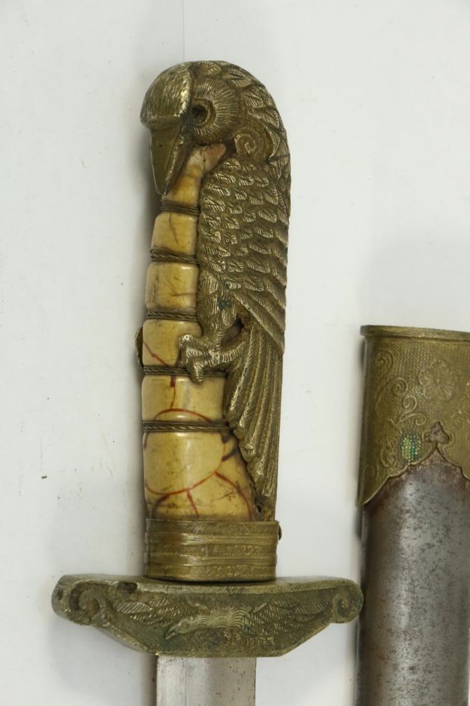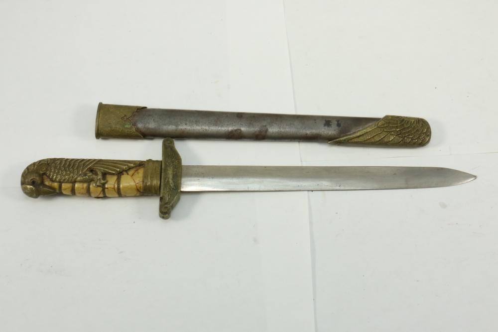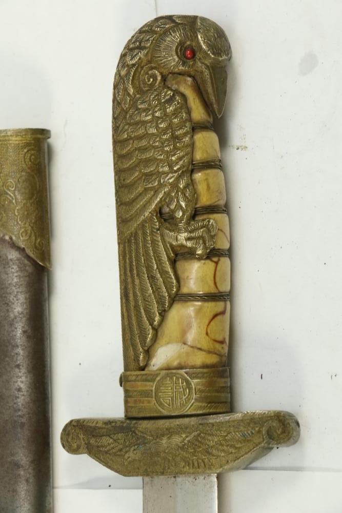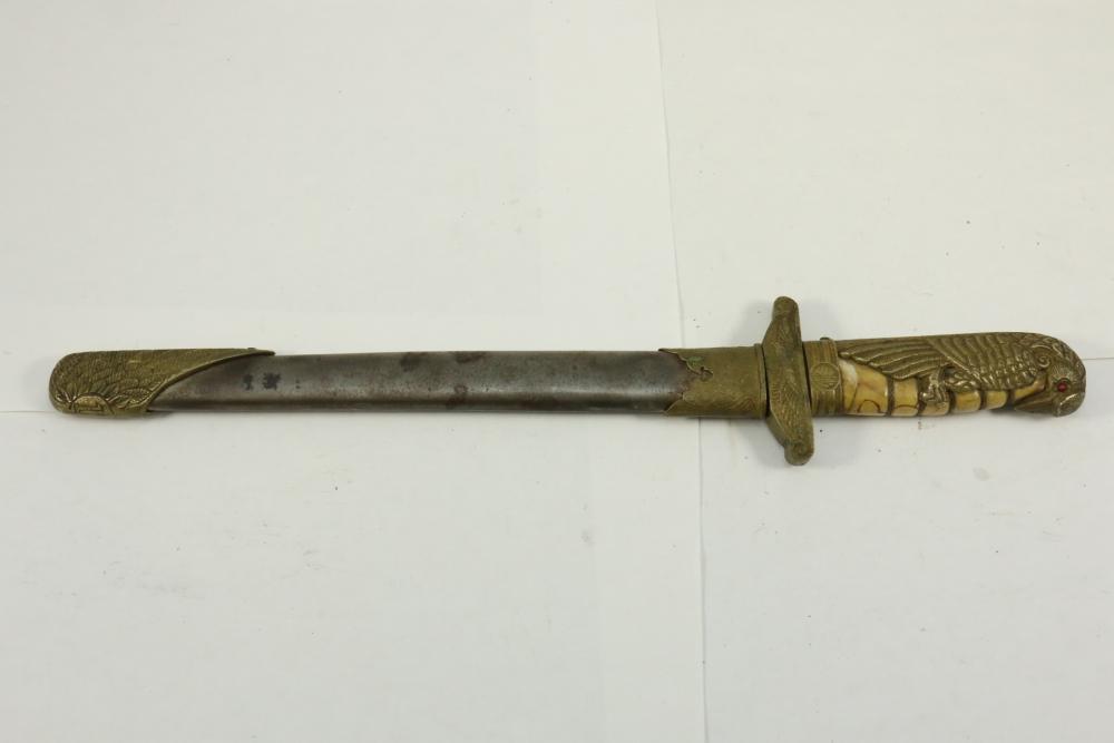 Chinese Nationalist Air Force Officers dirk/dagger, having bird of prey on cross-guard, with inscription on ferrule, and eagle casting on backside of grip with head being pommel, one eye of eagle having red glass eye (other eye missing), scabbard end having the number "12" engrave, length of dagger without scabbard 13.5"L.