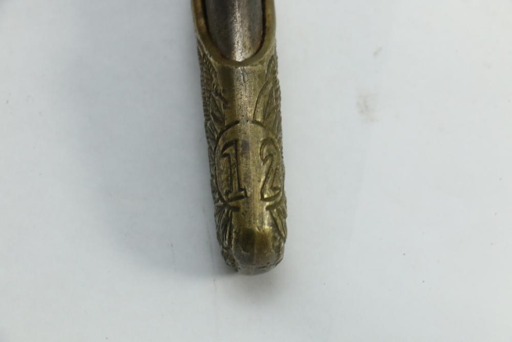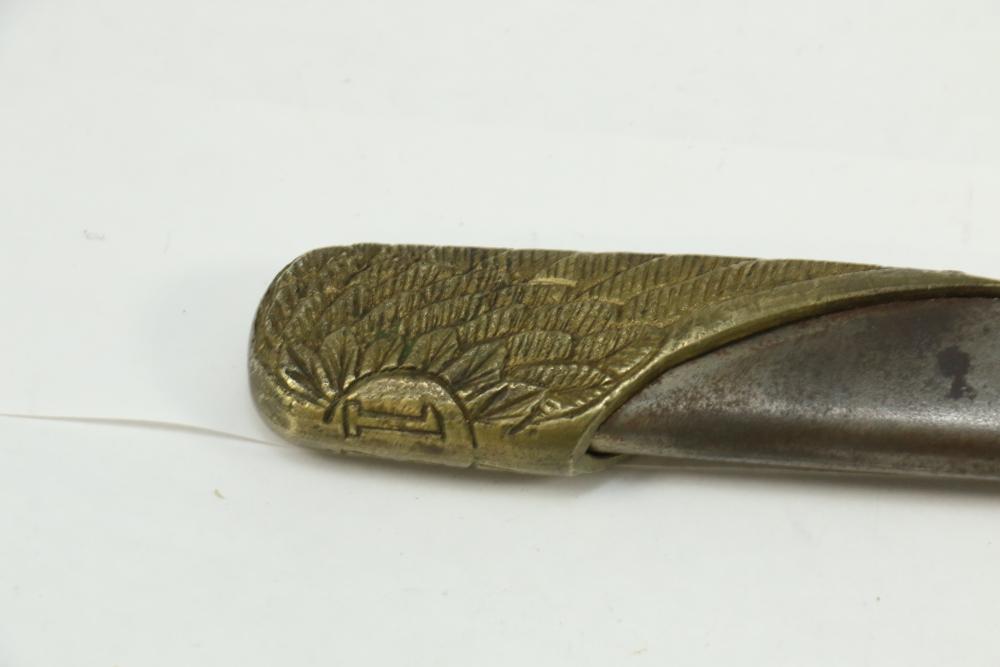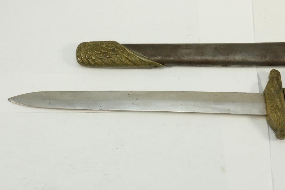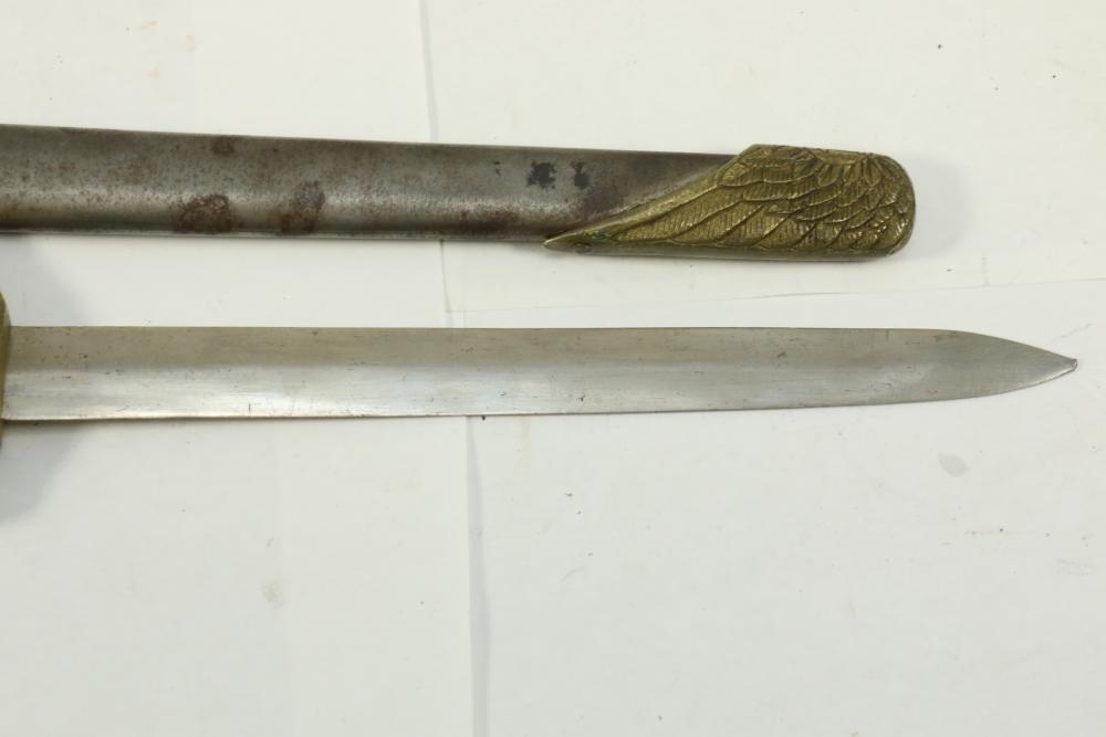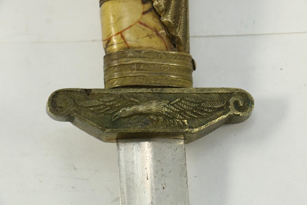 Chinese Nationalist Air Force Officers dirk/dagger, having bird of prey on cross-guard, with inscription on ferrule, and eagle casting on backside of grip with head being pommel, one eye of eagle having red glass eye (other eye missing), scabbard end having the number "12" engrave, length of dagger without scabbard 13.5"L.