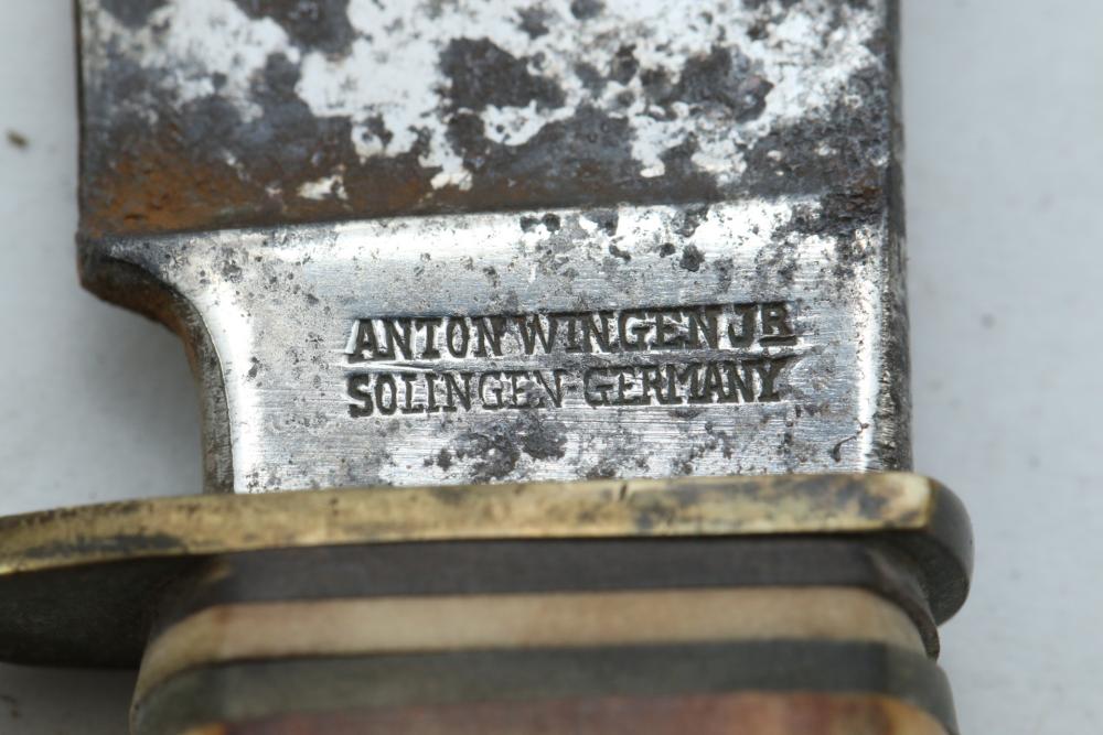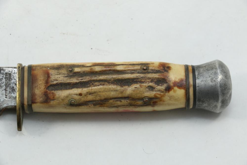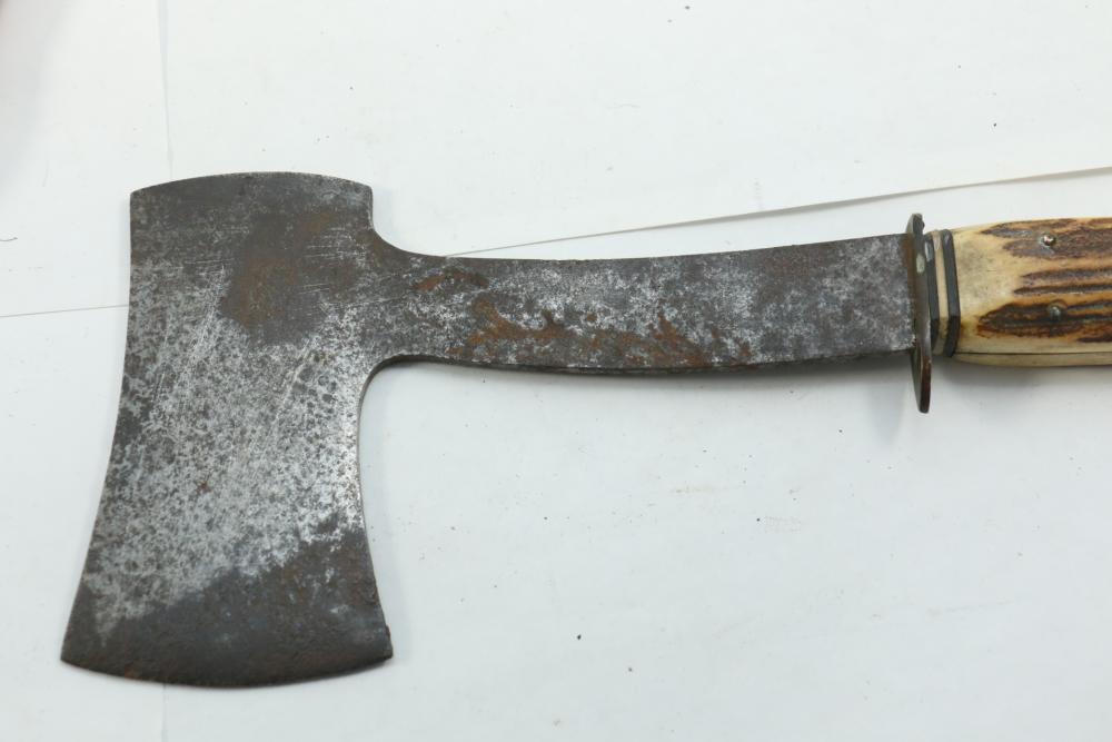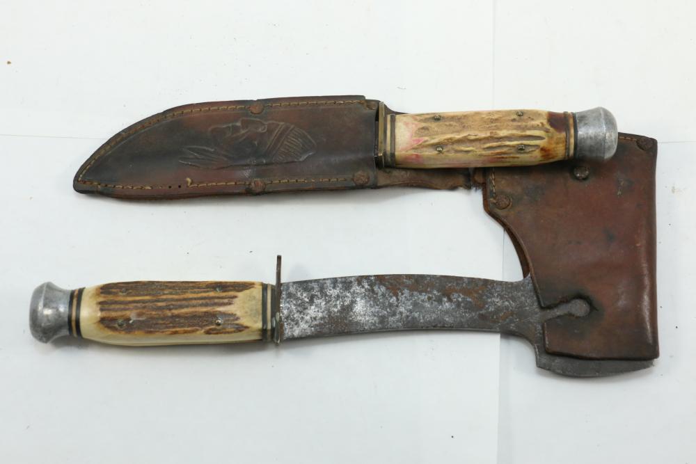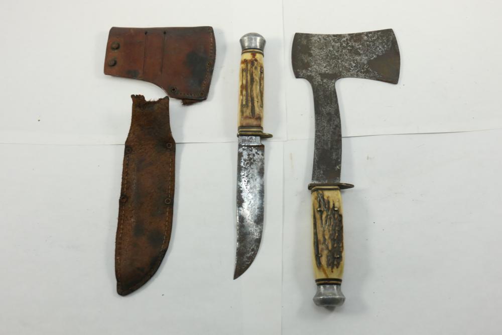 German hunting knife & hatchet stag handle combo marked at base of knife blade "Anton Wingen Jr Solingen-Germany", and reverse marked "Othello Solingen", length of knife 9.25"L, hatchet stamped "Anton Wingen Jr Solingen-Germany", length of hatchet 10.75"L.