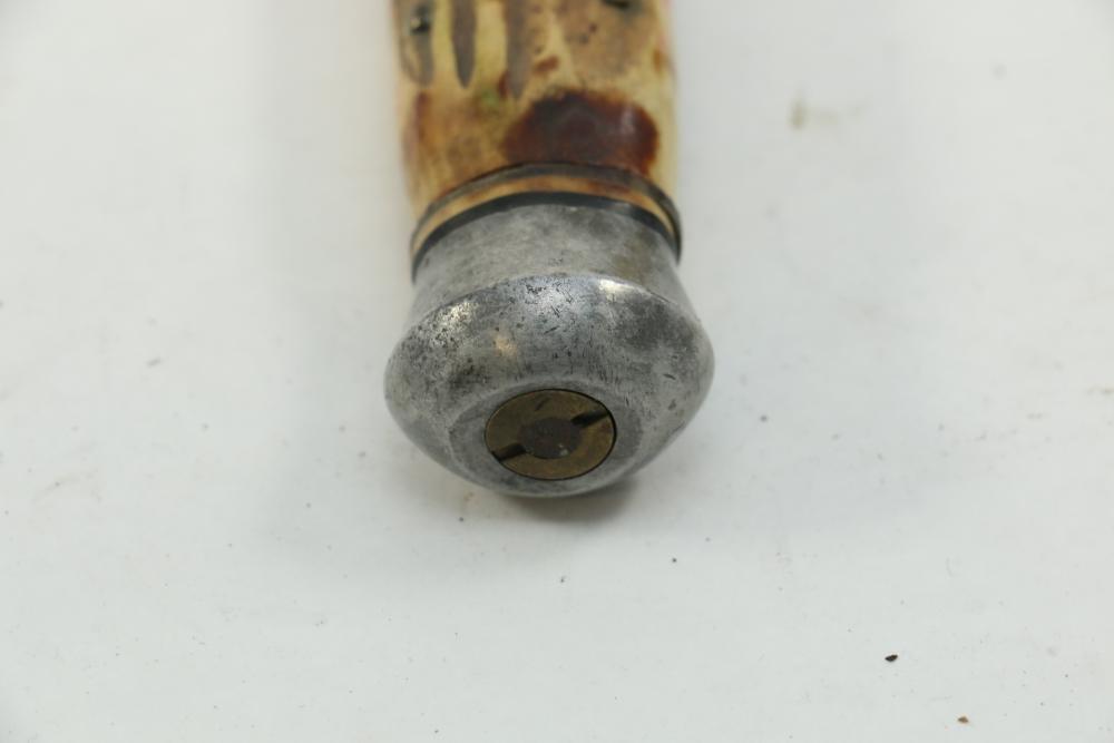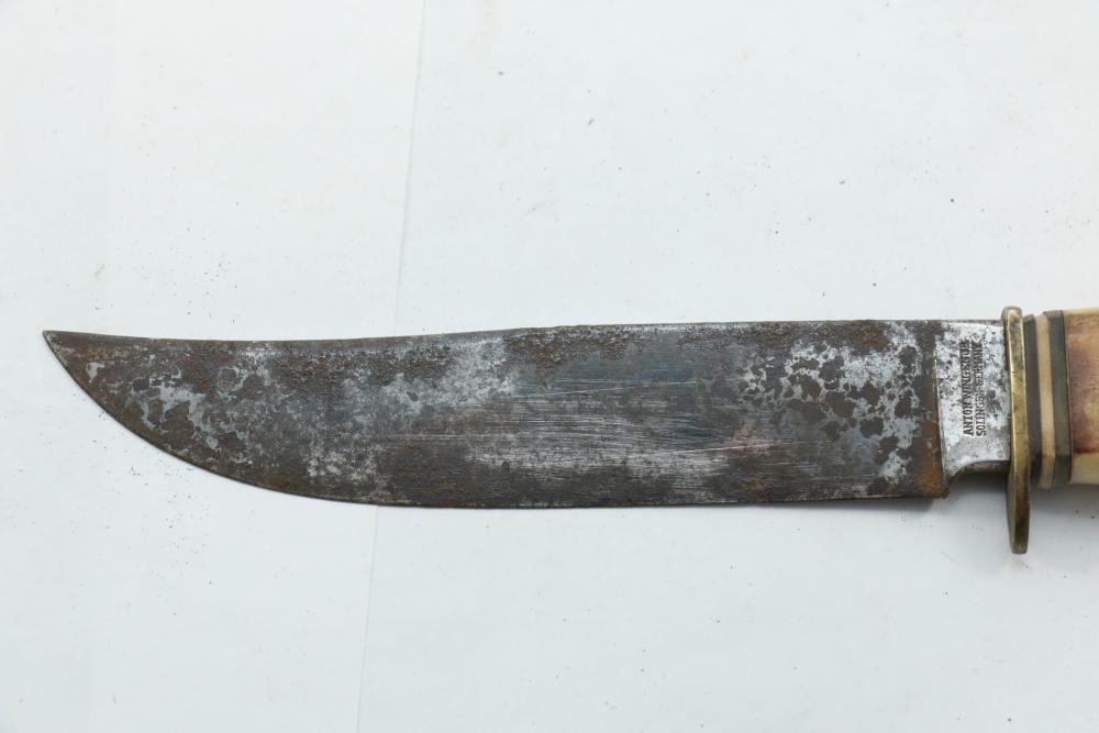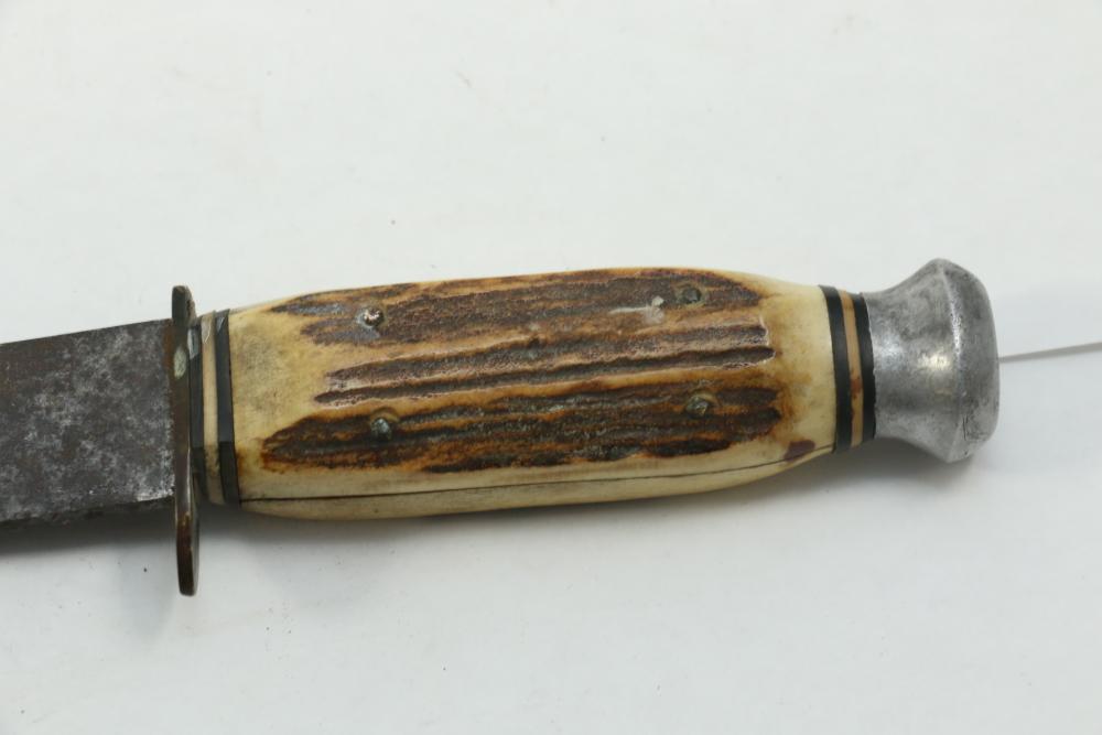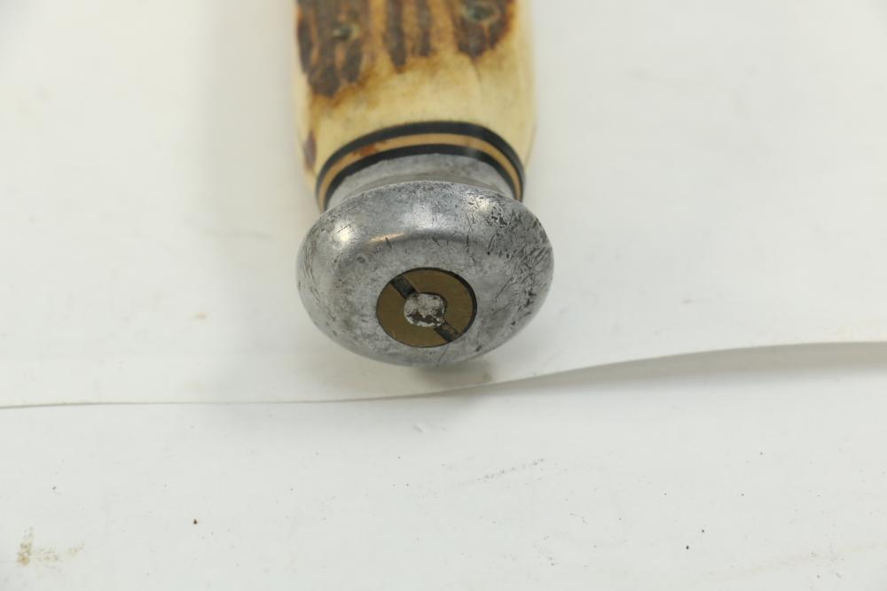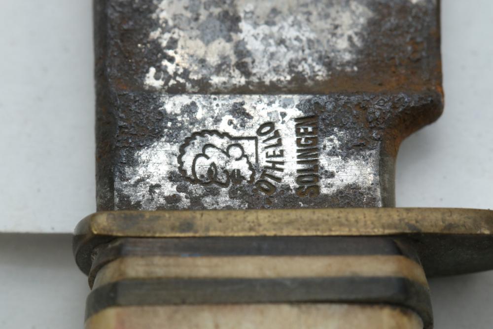German hunting knife & hatchet stag handle combo marked at base of knife blade "Anton Wingen Jr Solingen-Germany", and reverse marked "Othello Solingen", length of knife 9.25"L, hatchet stamped "Anton Wingen Jr Solingen-Germany", length of hatchet 10.75"L.