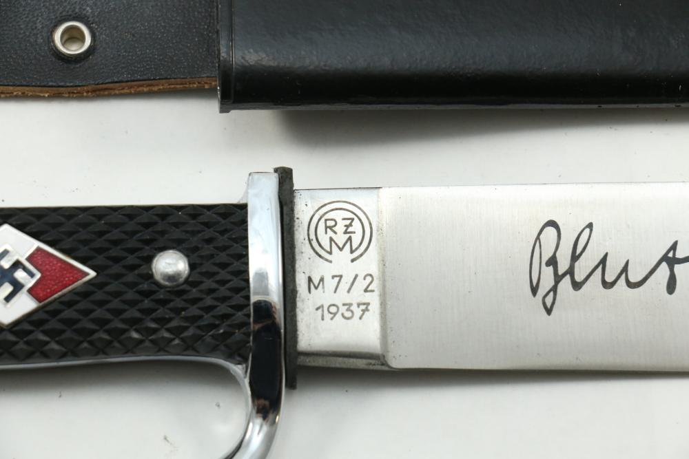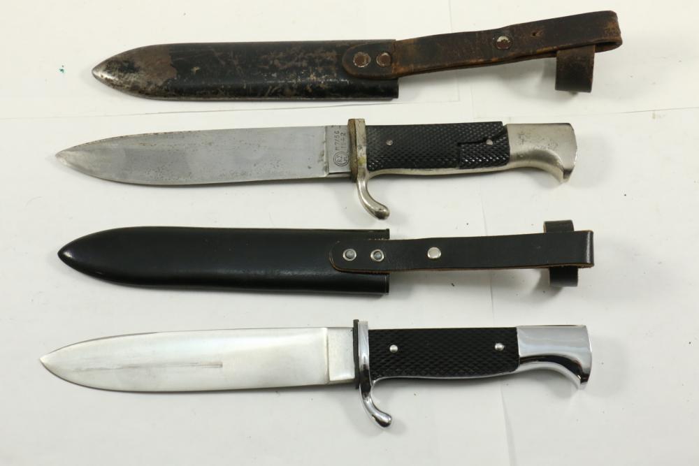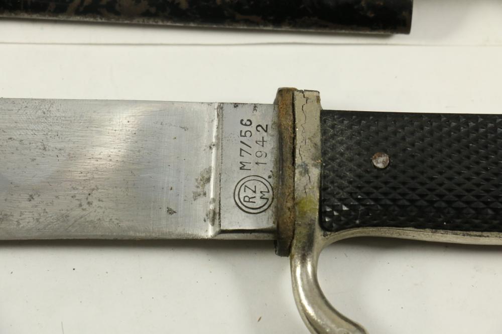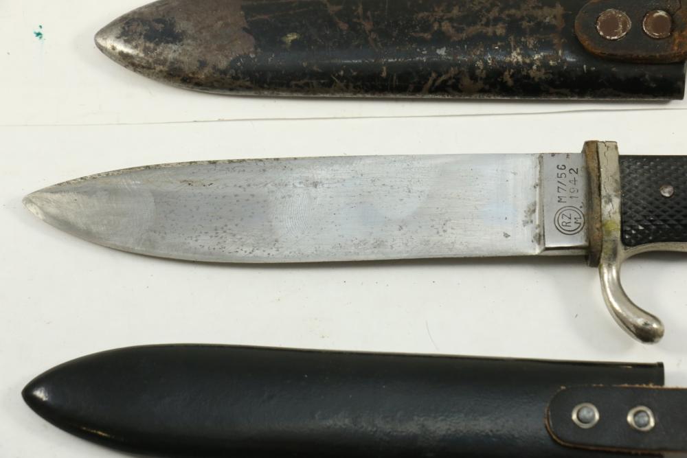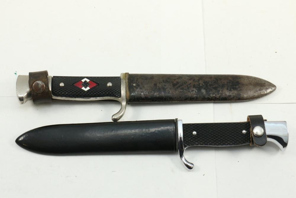 Two WWII German Hitler youth daggers with scabbards one marked on ricasso "RZM M7/56 1942", second marked on ricasso "RZM M7/2 1937", blade marked "Blut und Ehre!"(Blood and Honor!), both daggers without scabbard measuring 9.5"L.