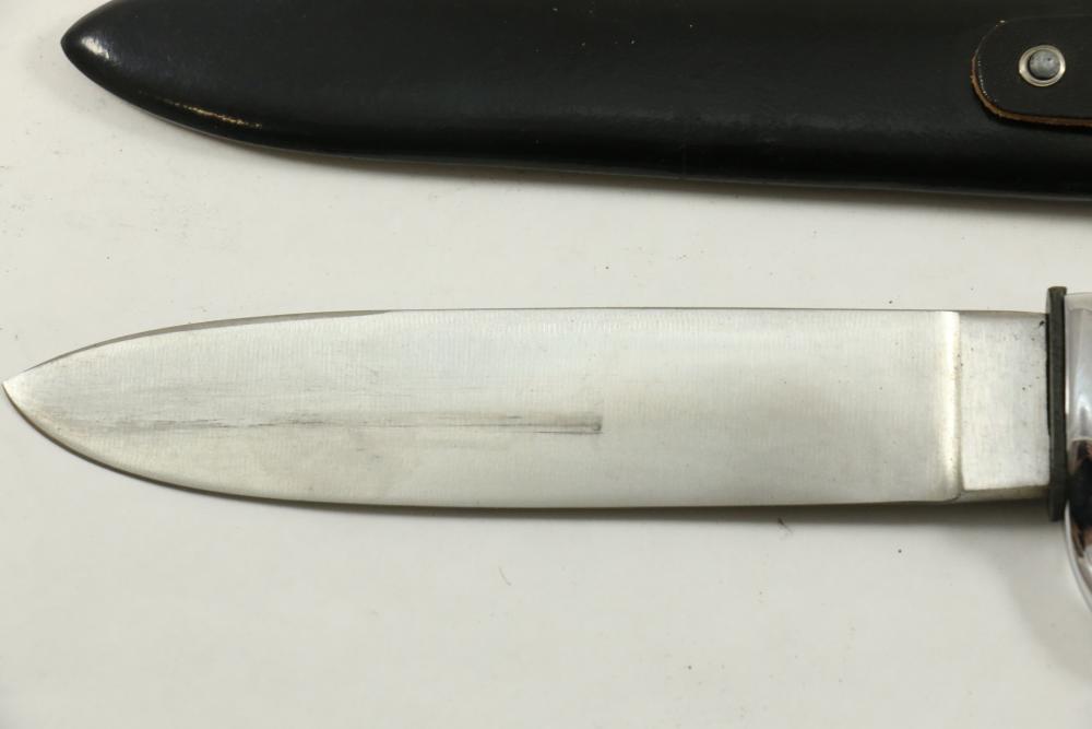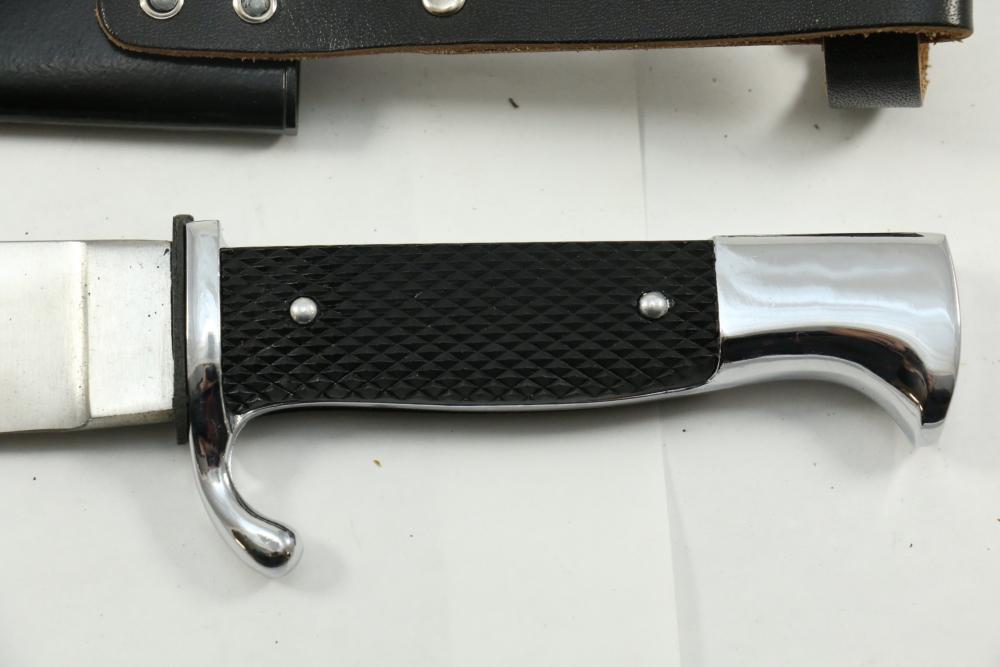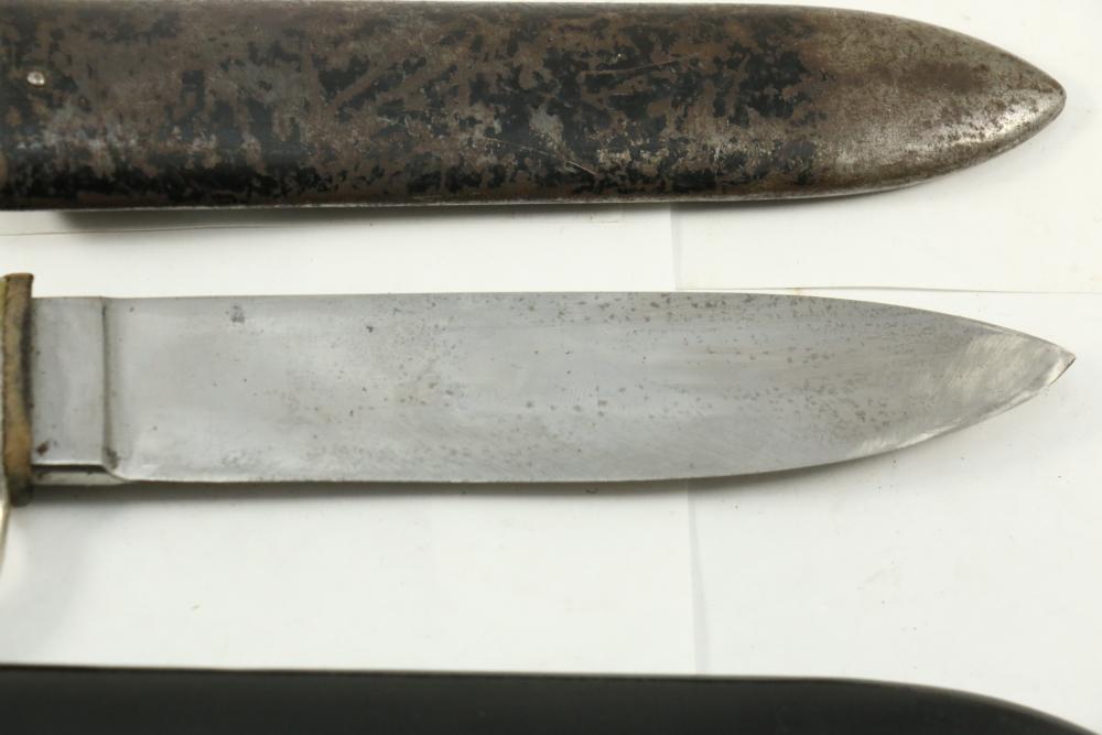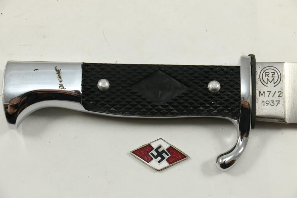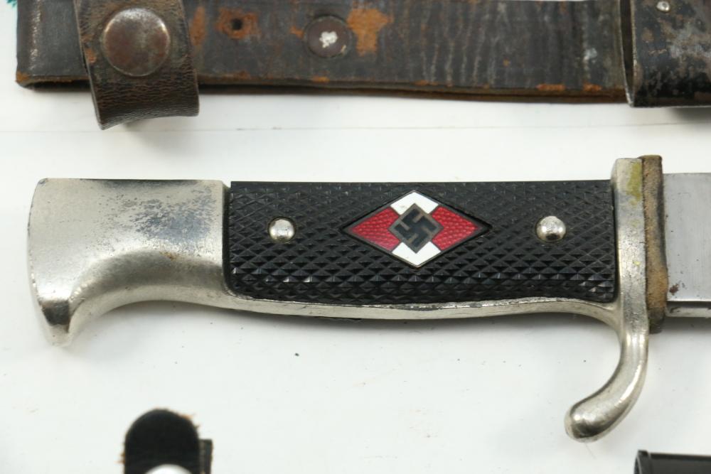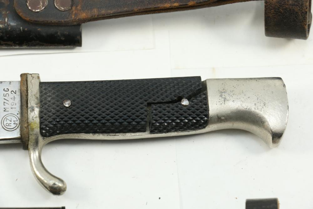 Two WWII German Hitler youth daggers with scabbards one marked on ricasso "RZM M7/56 1942", second marked on ricasso "RZM M7/2 1937", blade marked "Blut und Ehre!"(Blood and Honor!), both daggers without scabbard measuring 9.5"L.