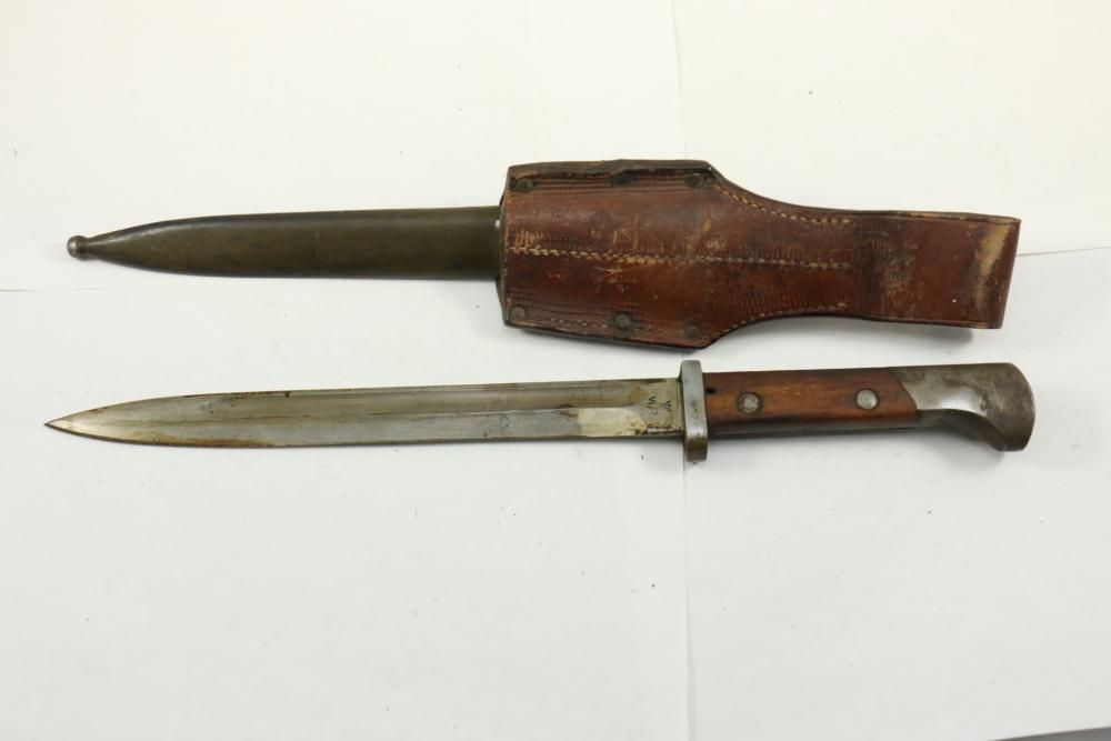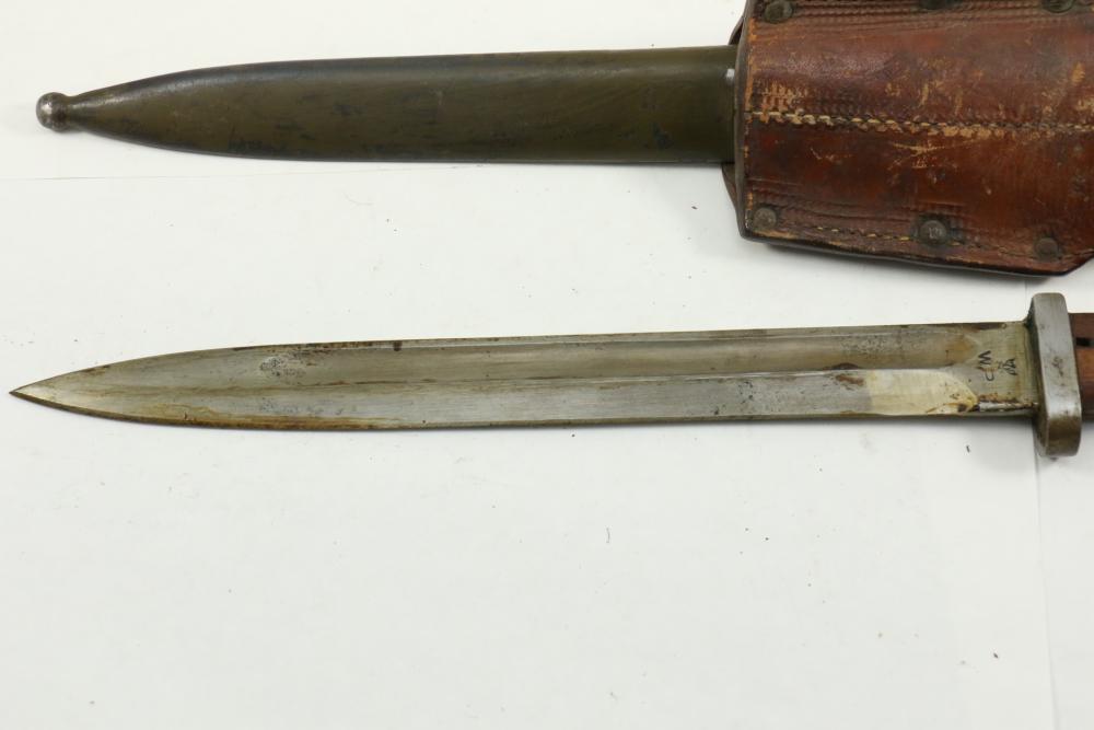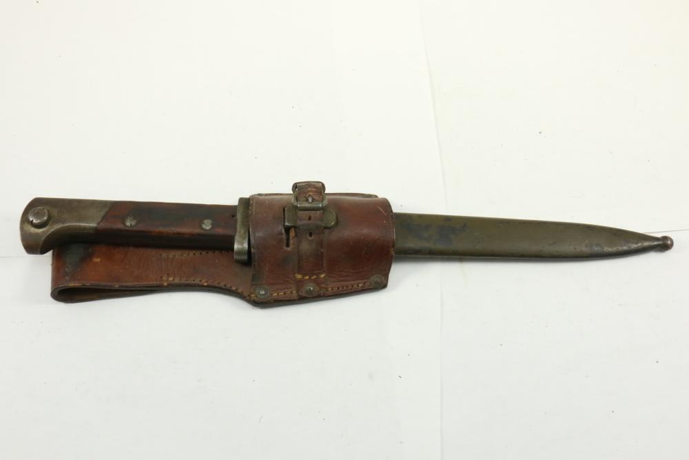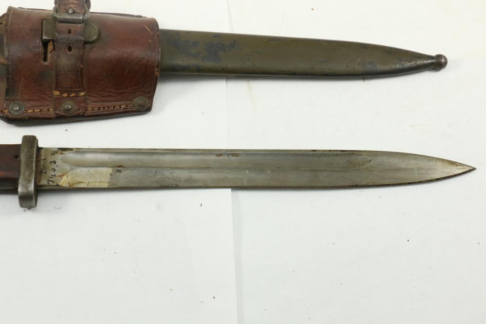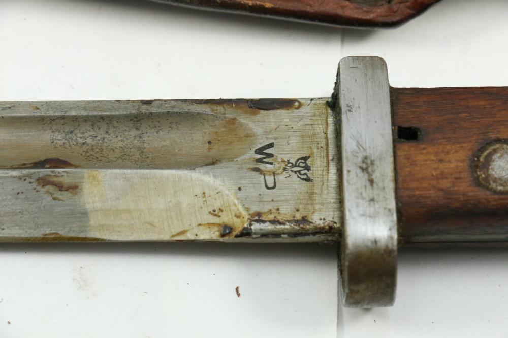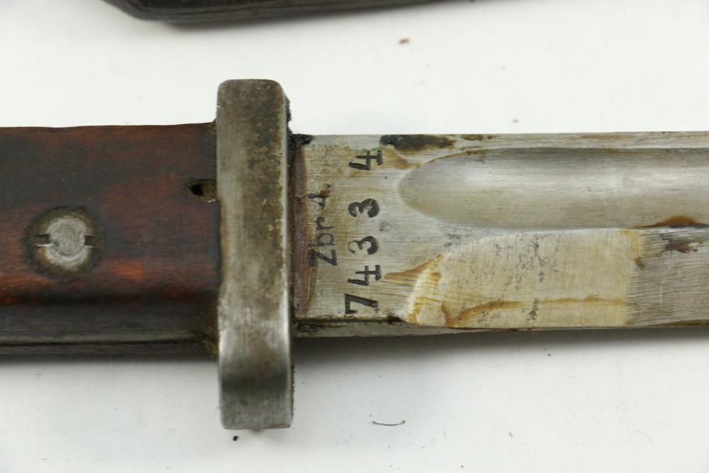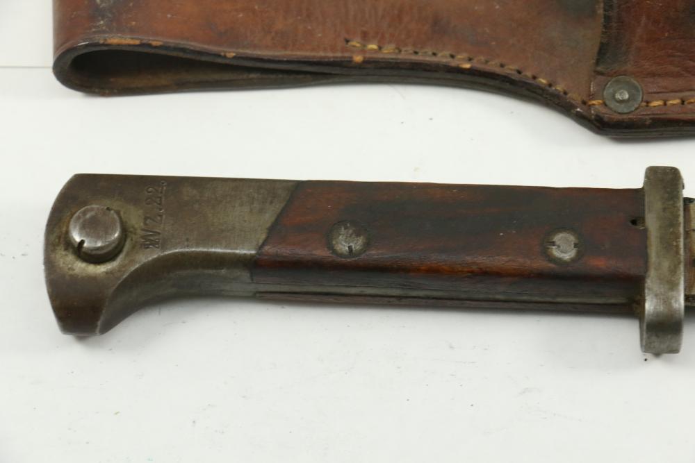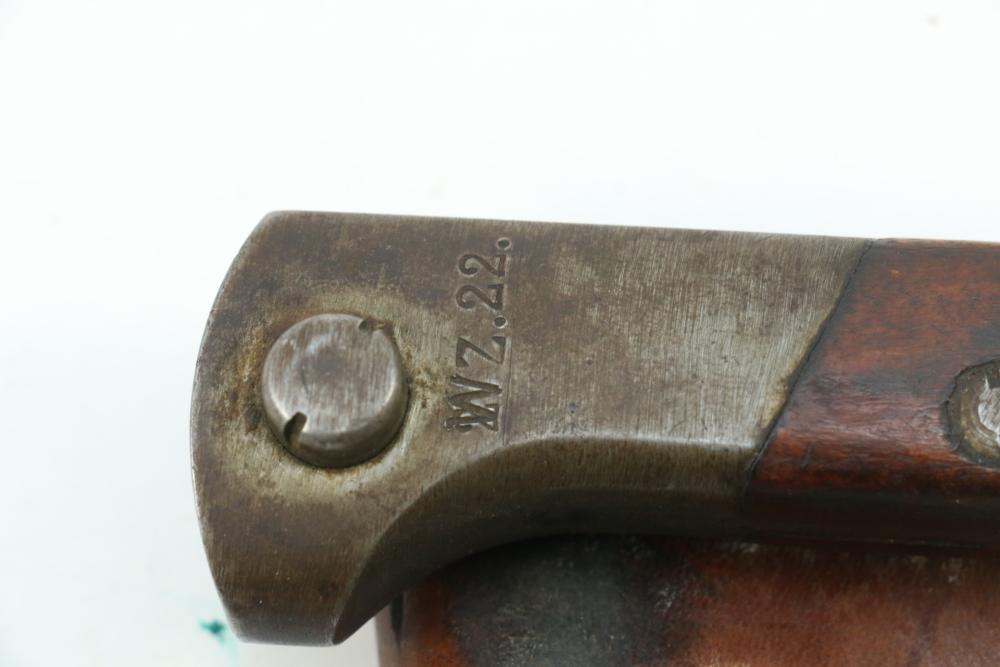 Polish Army M1922 bayonet with sheath, pommel marked "WZ.22."(the "W" is stamped over an additional "2"), ricasso marked "Zbr4. 74334", reverse marked with Polish eagle over "W.P" (Wojsko Polskie = Polish Army), length of bayonet without sheath 15"L.