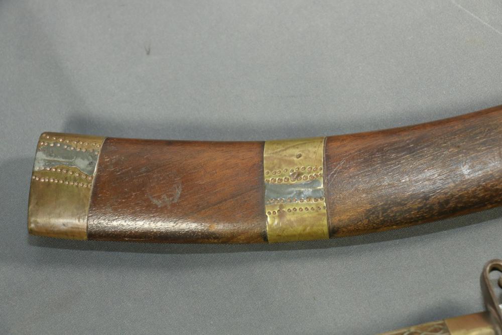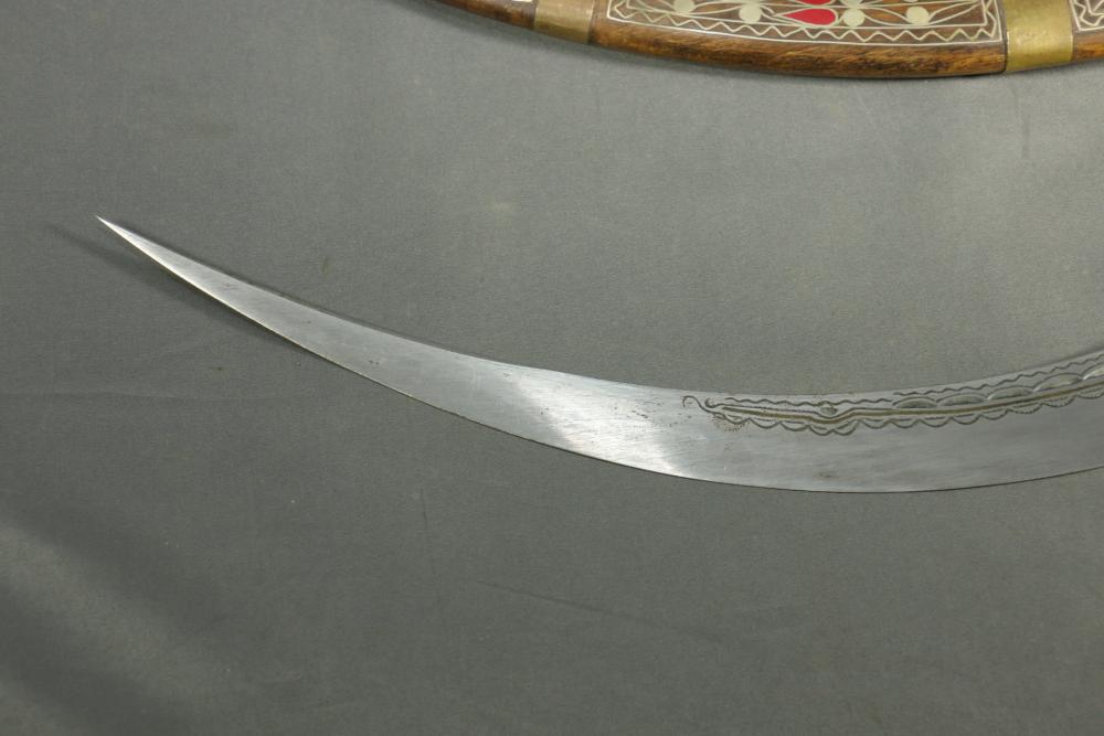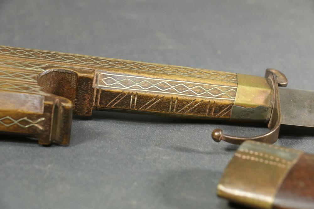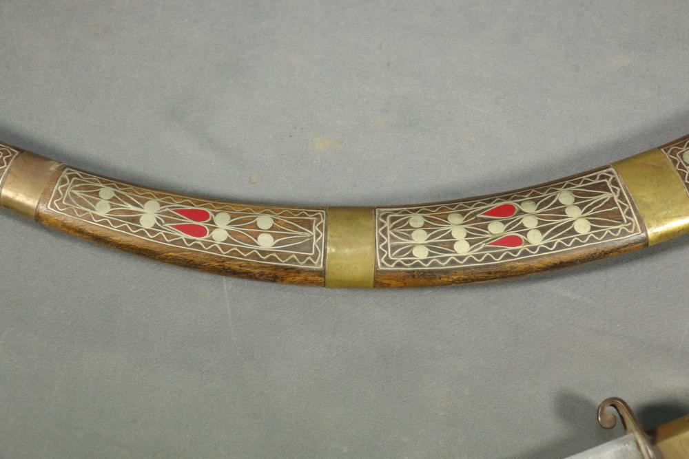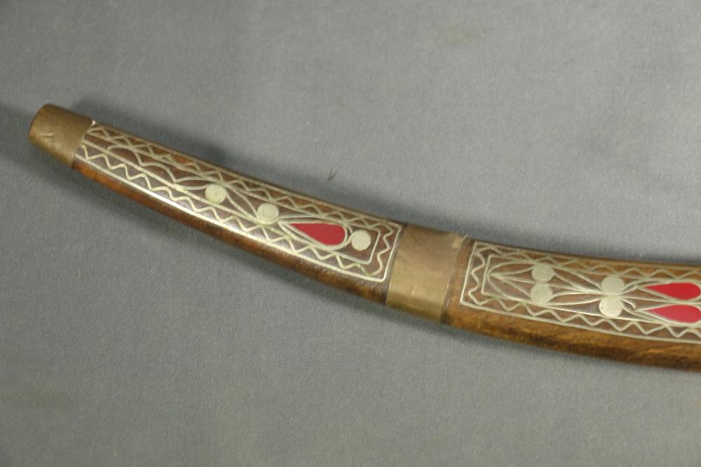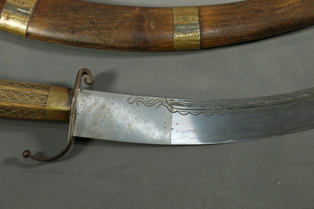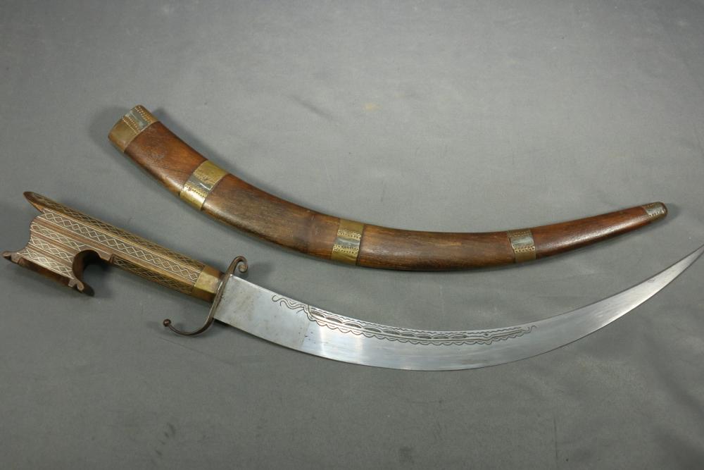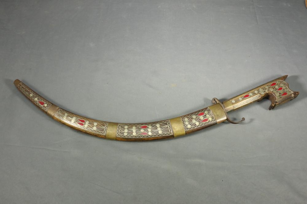 Moroccan sword scimitar with sheath, blade having decorative engraving, handle and sheath having wire inlay with brass accents, length of sword without sheath approx 21.5"L.