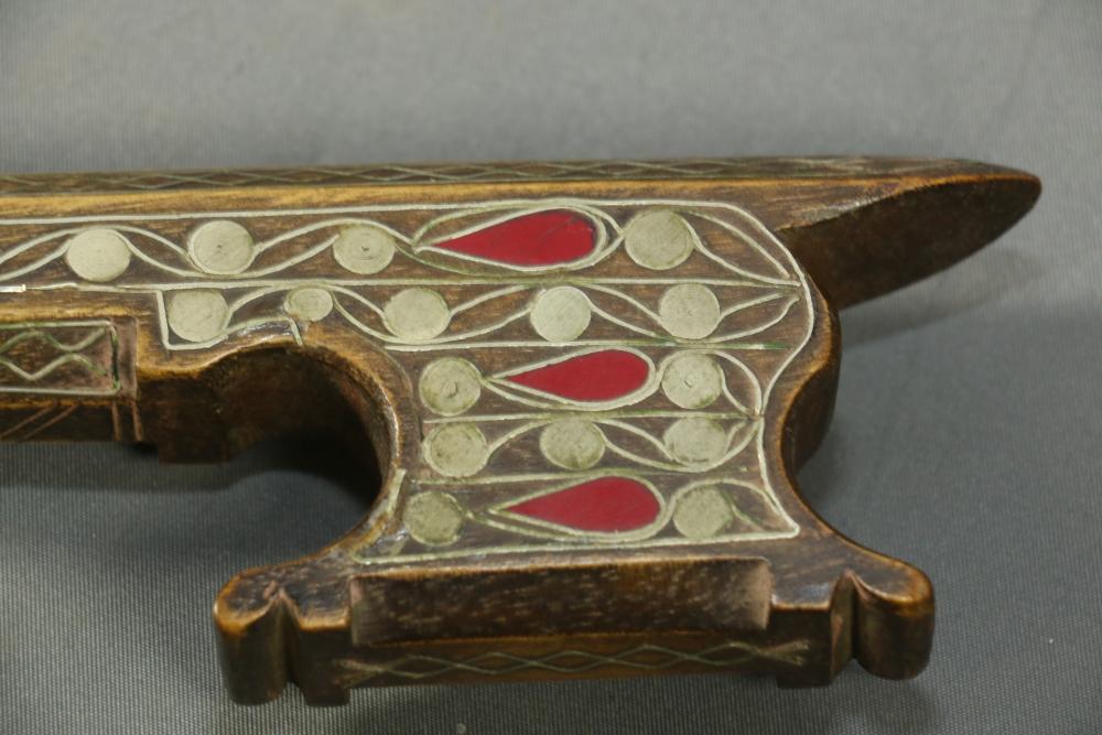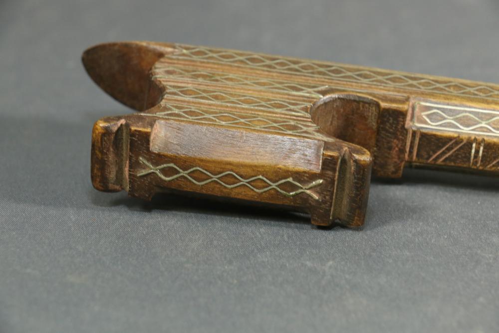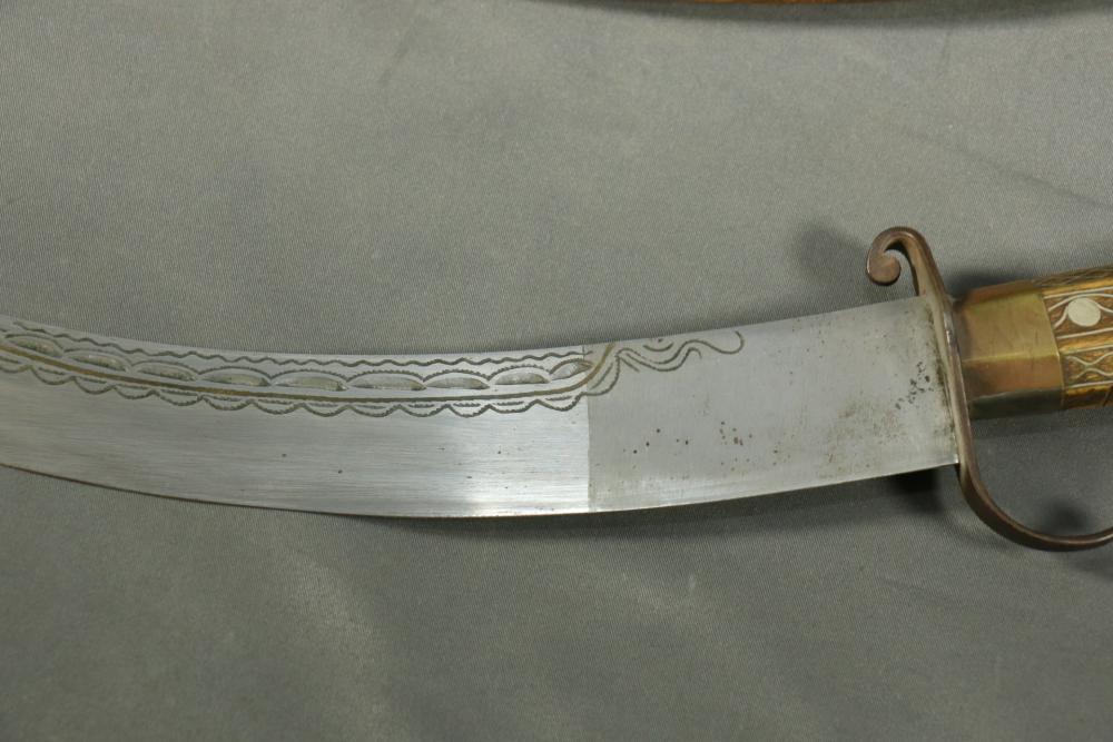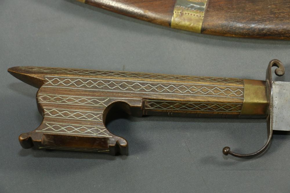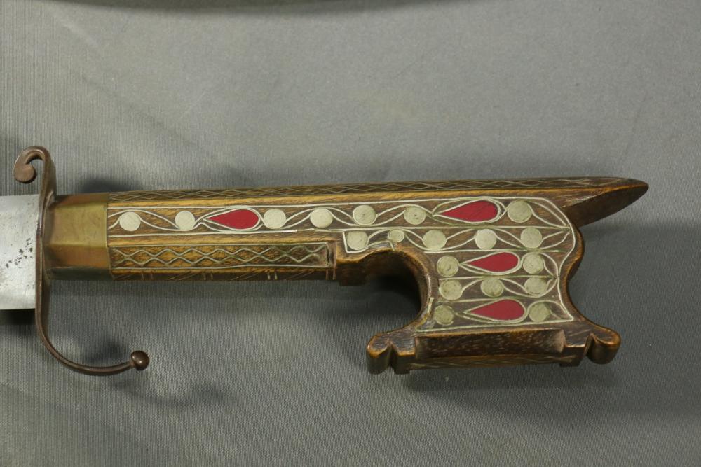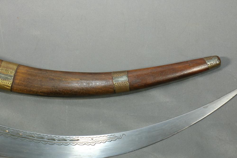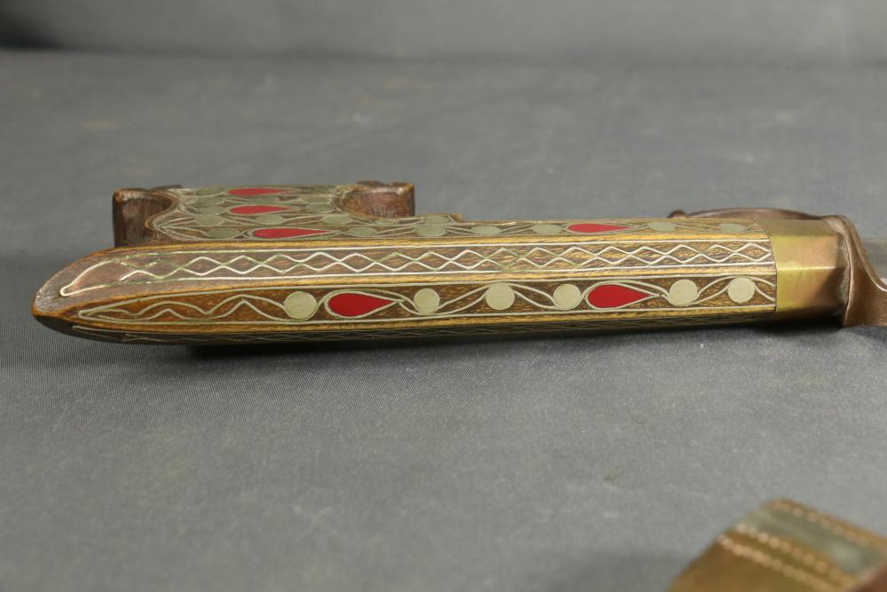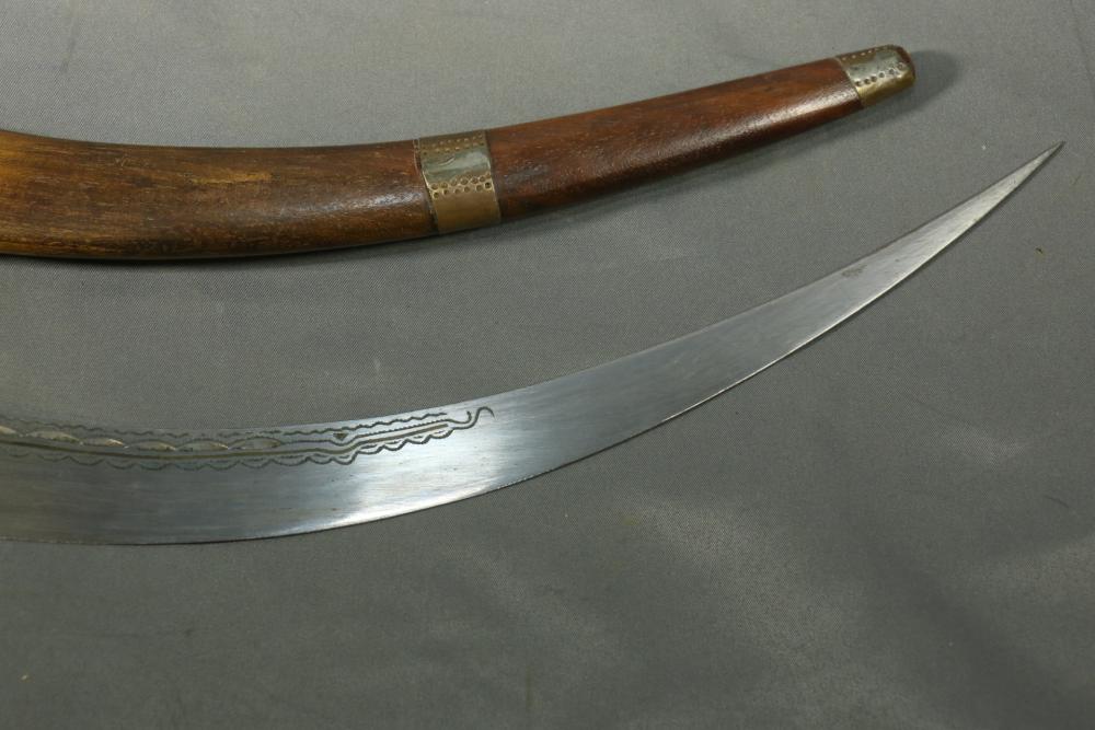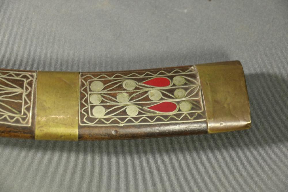 Moroccan sword scimitar with sheath, blade having decorative engraving, handle and sheath having wire inlay with brass accents, length of sword without sheath approx 21.5"L.
