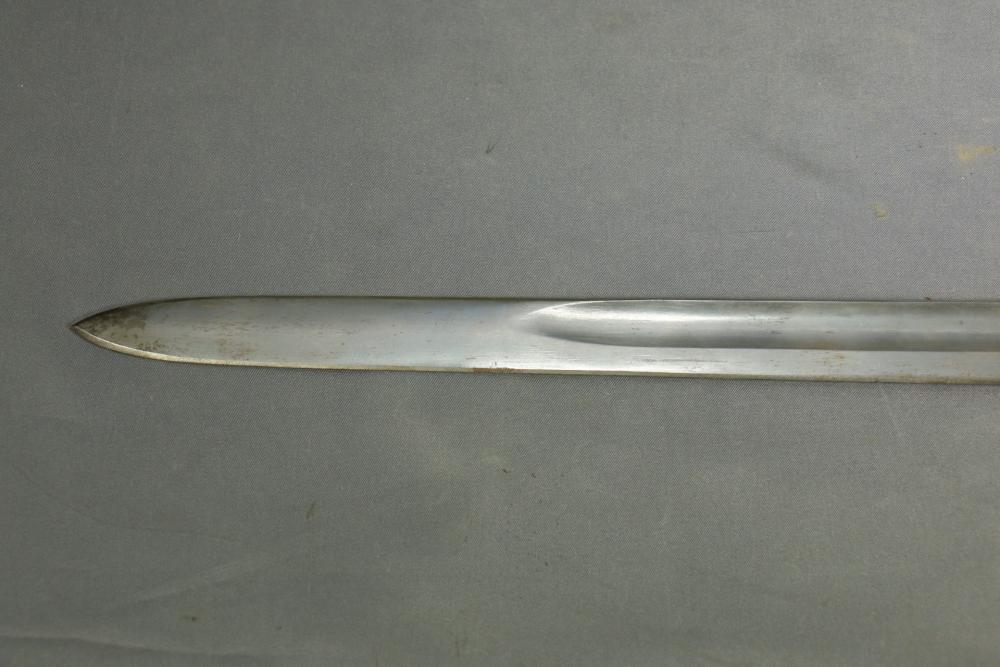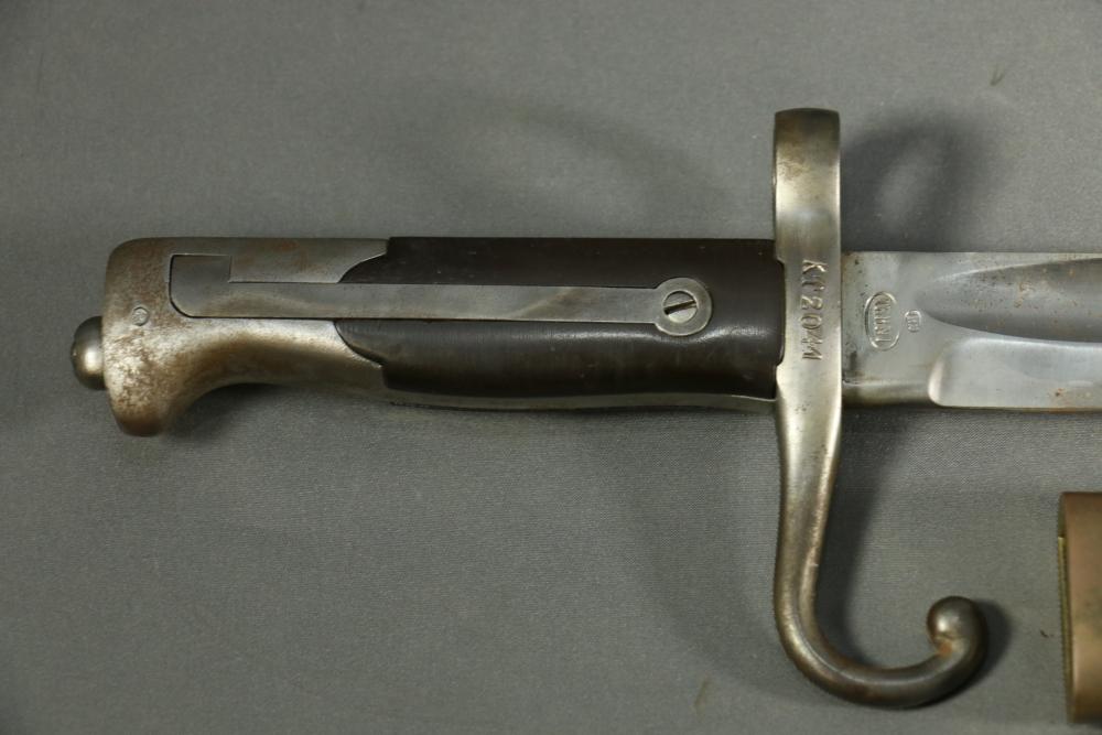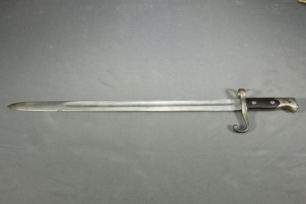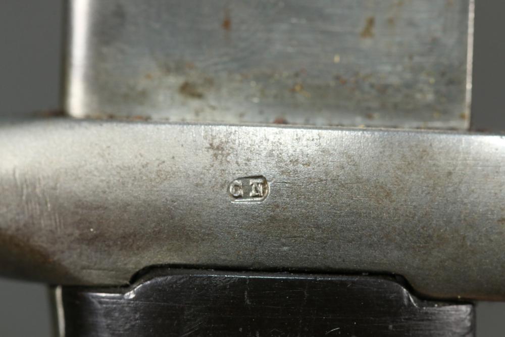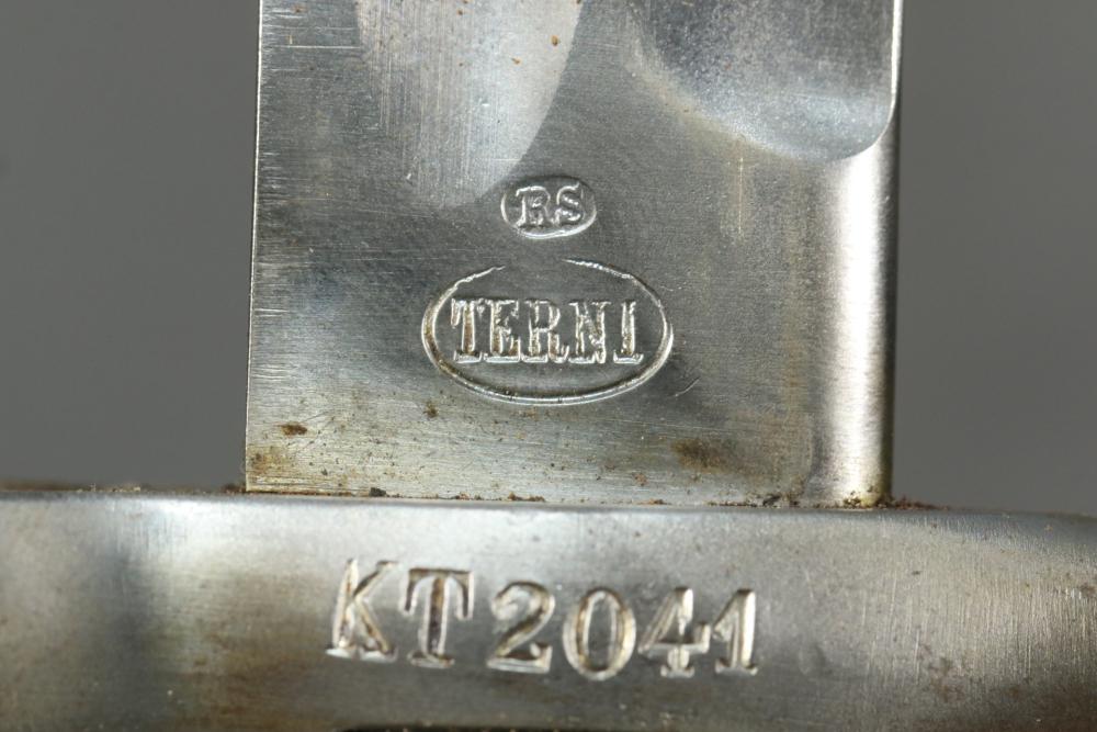 Believed to be Italian Sword bayonet for M1871 Vetterli rifles marked on ricasso "RS" and "Terni" both within respective ovals reverse blank, serial number on cross guard "KT2041", cross guard, pommel, and press stud marked "CN", length of bayonet 25.5"L.