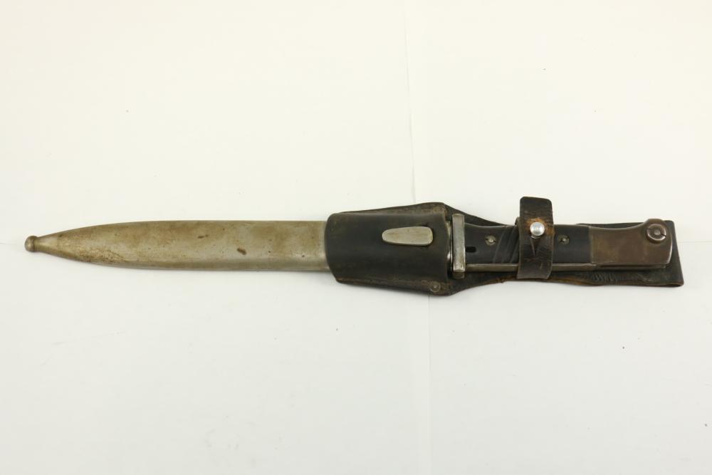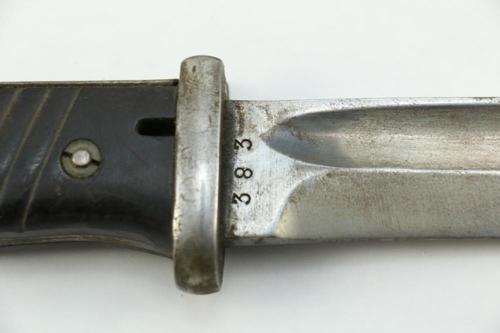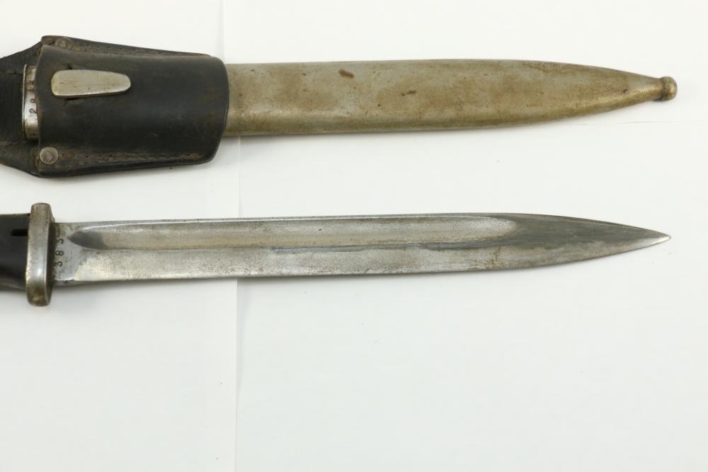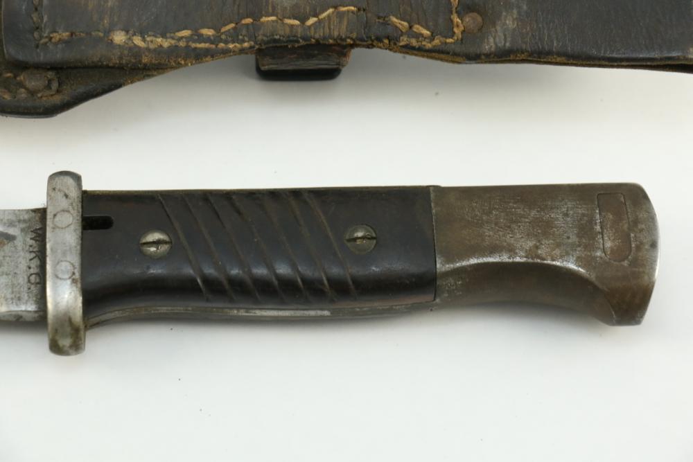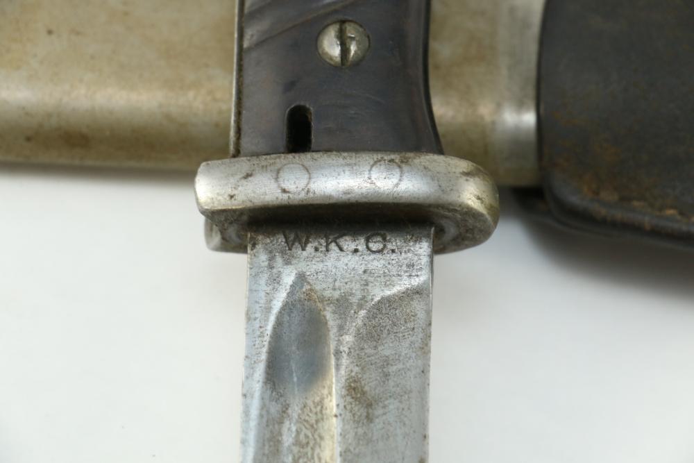 Believed to be W.K.C. K98 bayonet with single fuller on both sides, blade marked "W.K.C." with serial number "383" on reverse, scabbard serial number "2803" and reverse marked "43ASW",length of bayonet without scabbard 15".