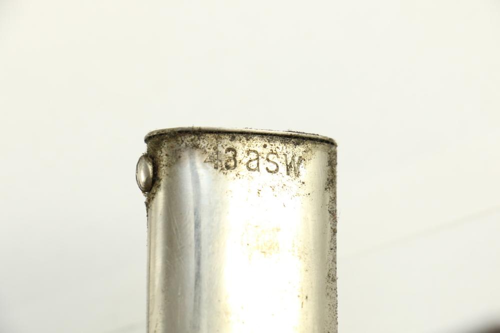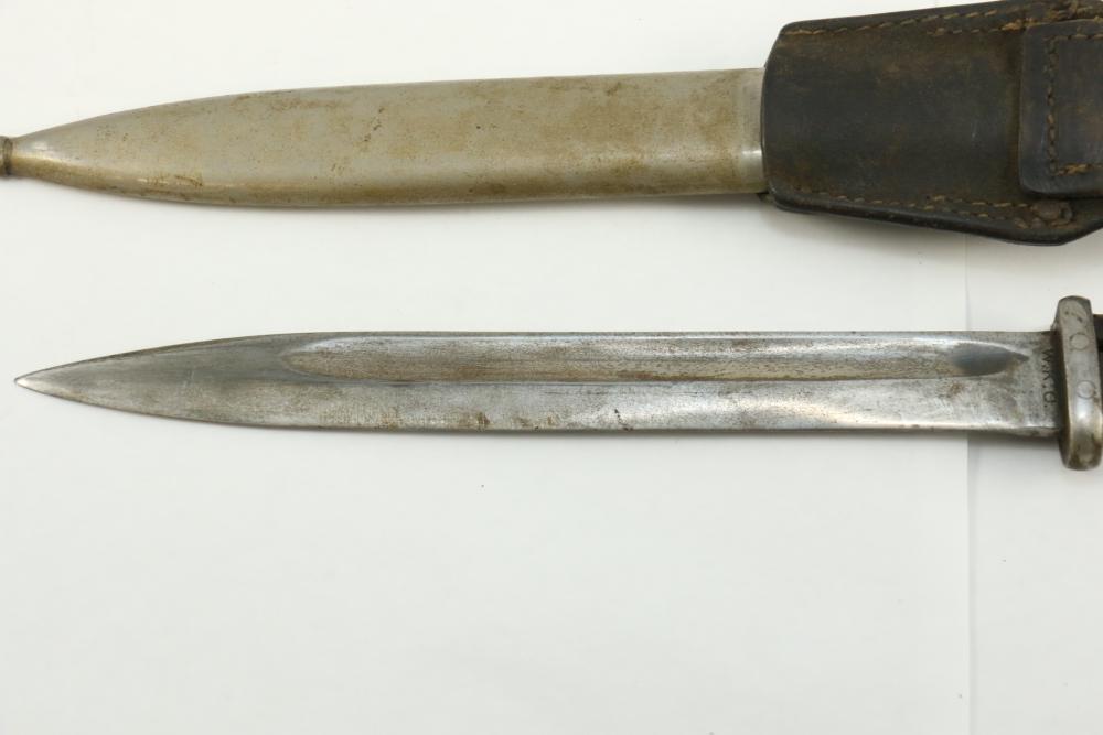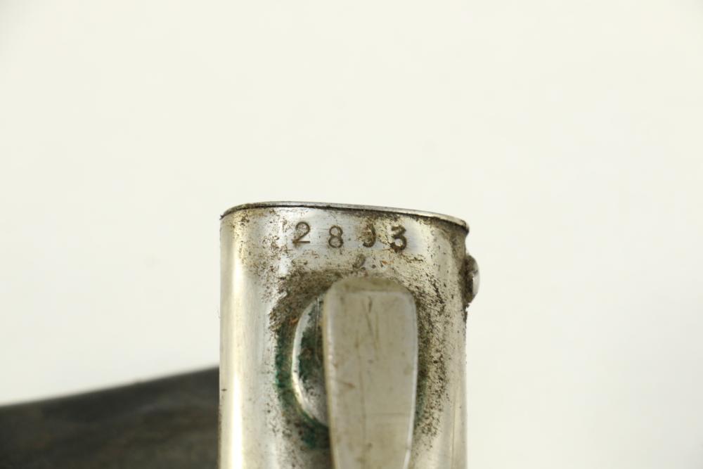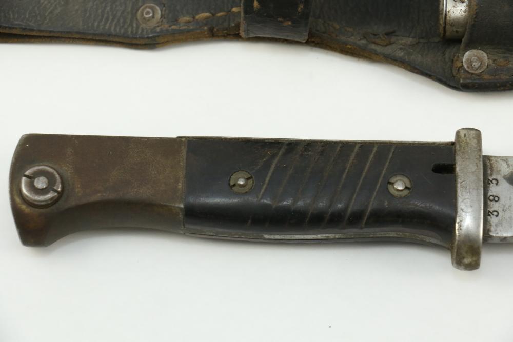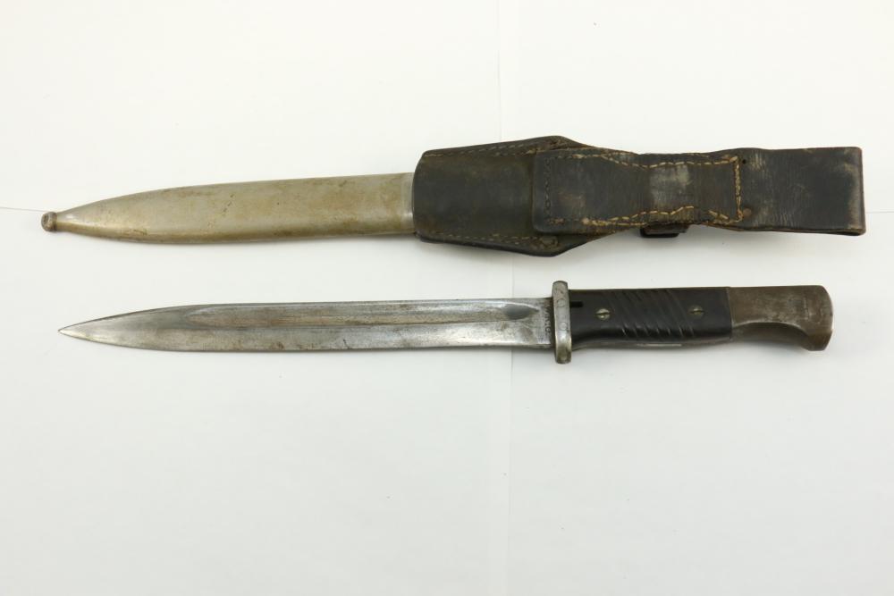 Believed to be W.K.C. K98 bayonet with single fuller on both sides, blade marked "W.K.C." with serial number "383" on reverse, scabbard serial number "2803" and reverse marked "43ASW",length of bayonet without scabbard 15".