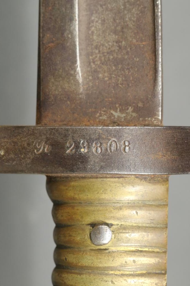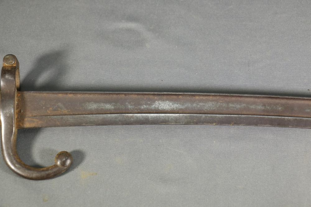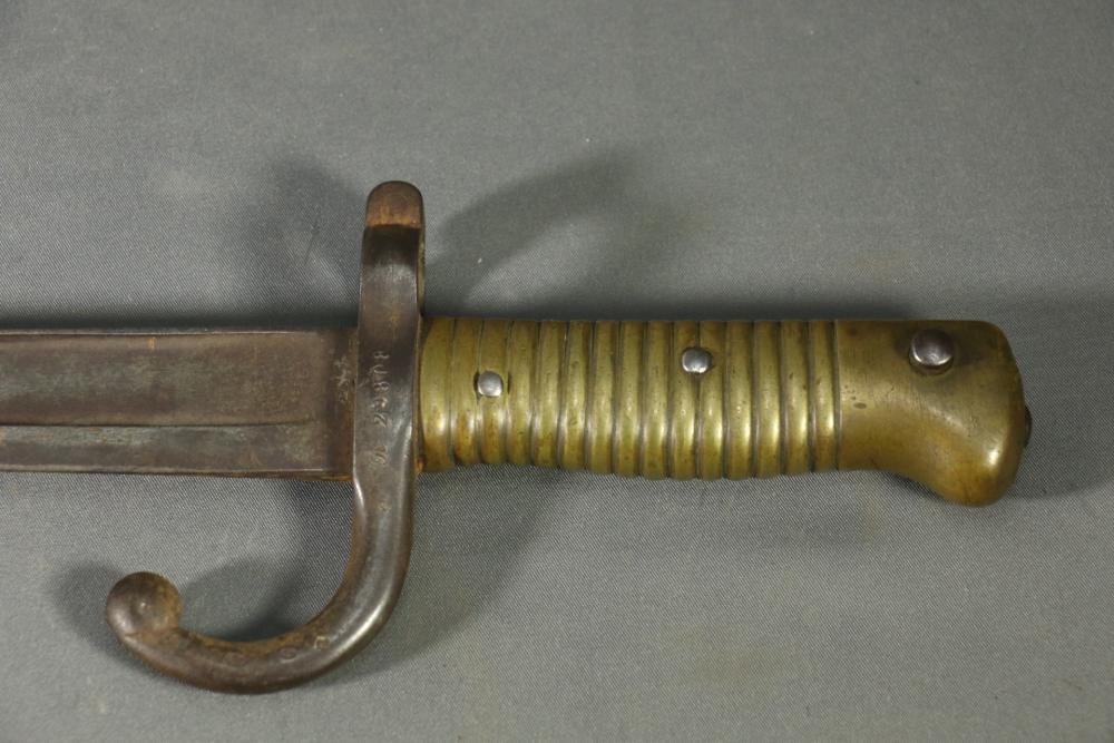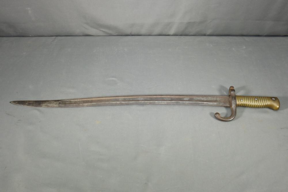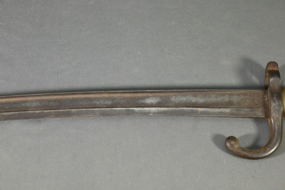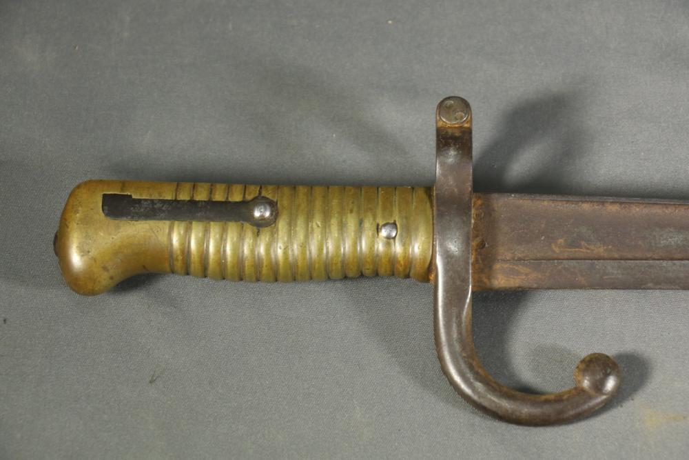 French Yataghan sword bayonet for M1866 Chassepot needle-fire rifle, having brass handle, ricasso marked with a "B" in a circle and an illegible marking next to it, cross guard with hallmarks and serial number 29808, spine marked appearing to read "St Etienne Glout(?) 1871", total length measuring 27.5"L.