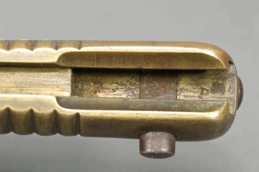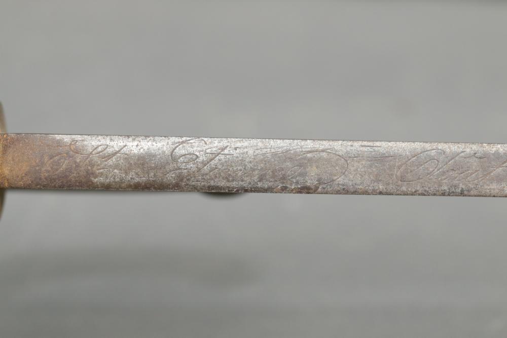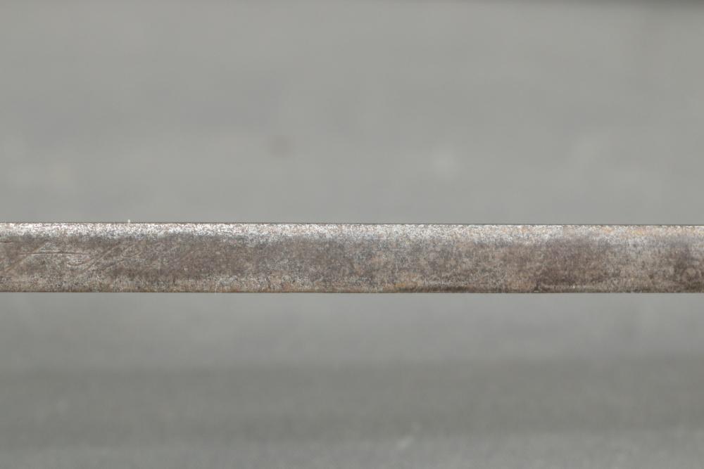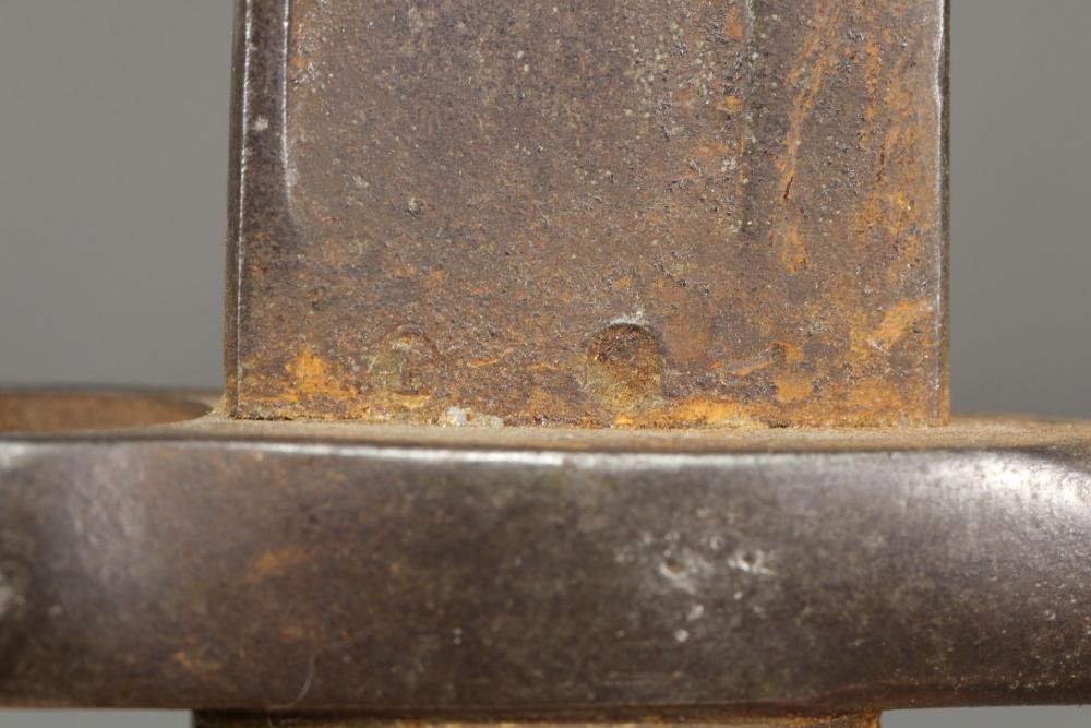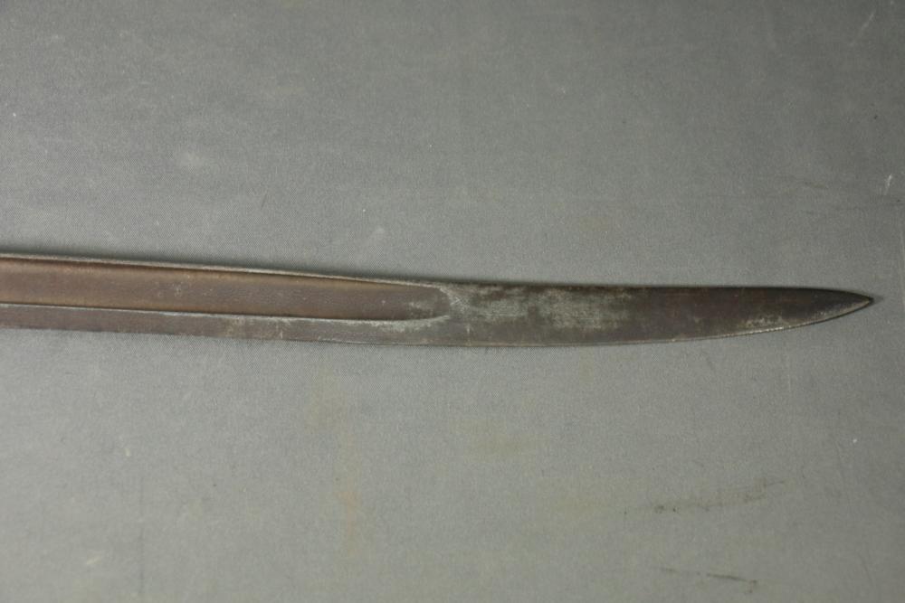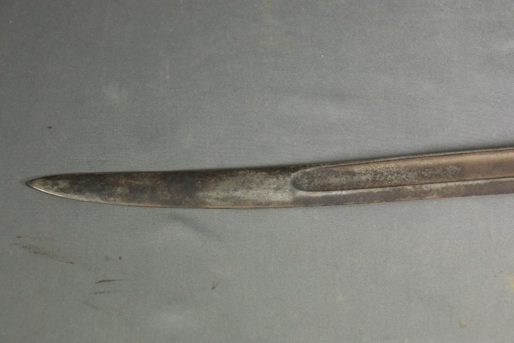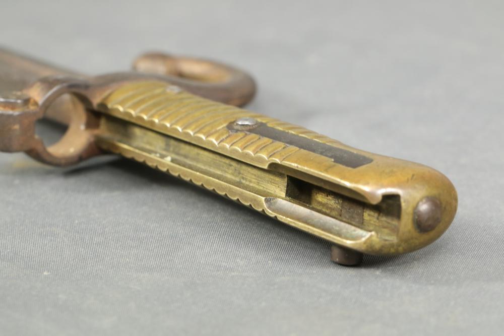 French Yataghan sword bayonet for M1866 Chassepot needle-fire rifle, having brass handle, ricasso marked with a "B" in a circle and an illegible marking next to it, cross guard with hallmarks and serial number 29808, spine marked appearing to read "St Etienne Glout(?) 1871", total length measuring 27.5"L.
