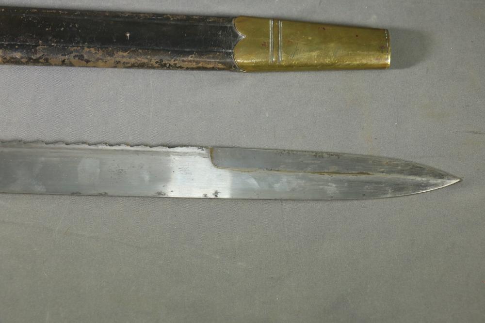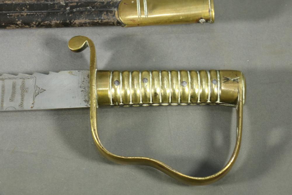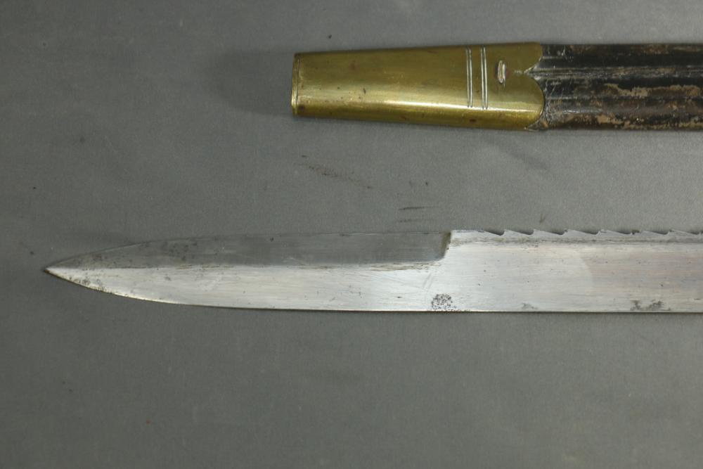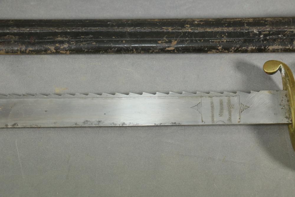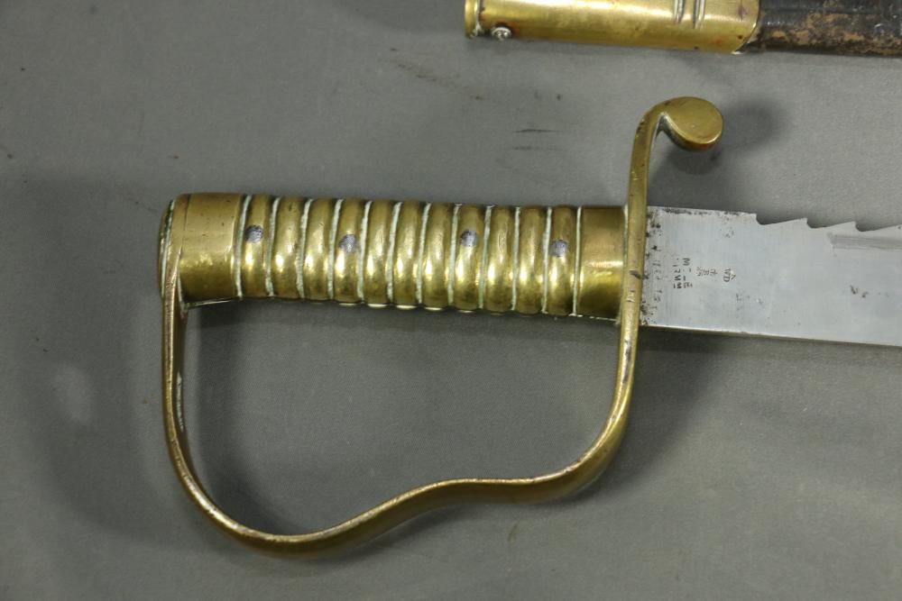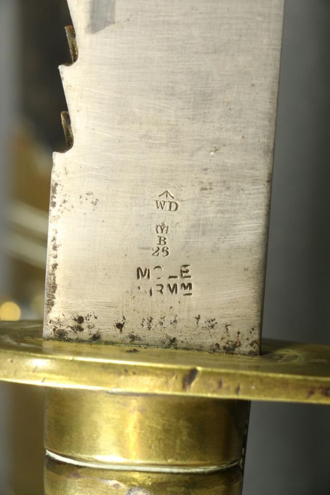 Robert Mole & Sons pioneers short sword with saw back blade in scabbard marked on ricasso "3/93", and on reverse an arrow over "WD" over a crown over "B" over "25, over "Mole Birmm", blade marked "Rob Mole & Sons Makers Birmingham", cross guard marked with the letter "N", pommel side of handle having crows feet style decoration, scabbard marked on upper brass portion with a crown over "43" over "W", length of sword without scabbard 27.75"L.