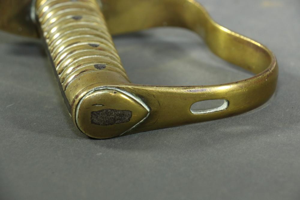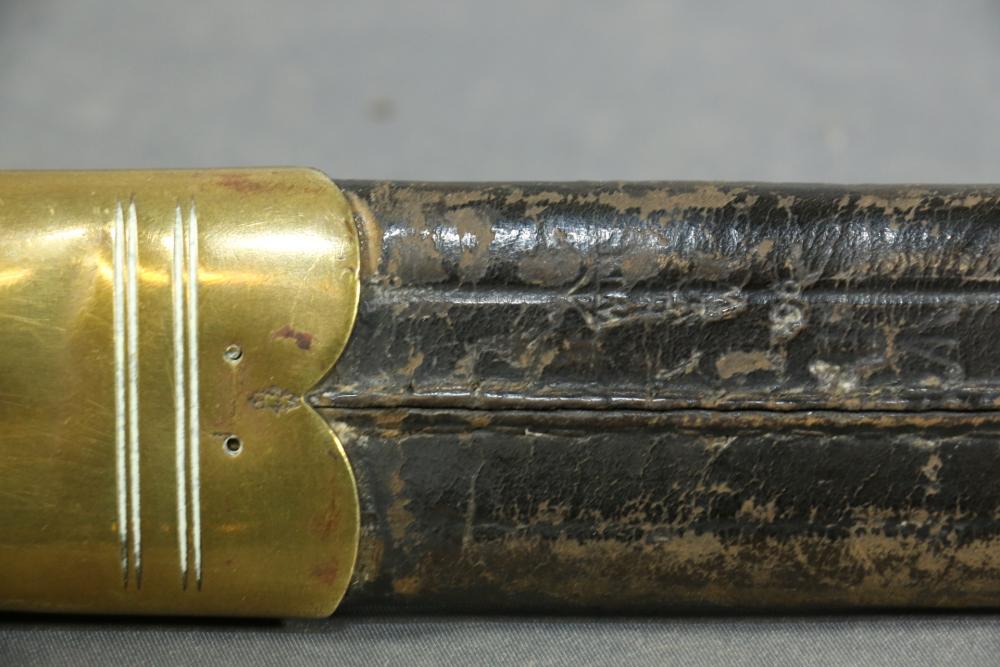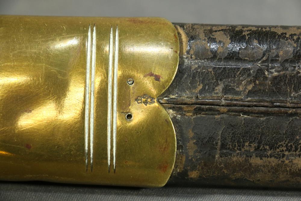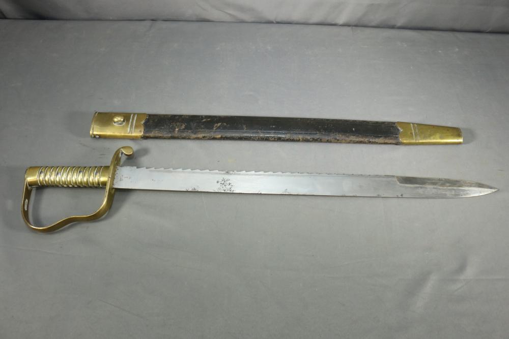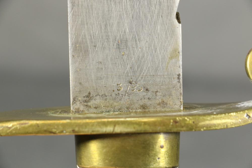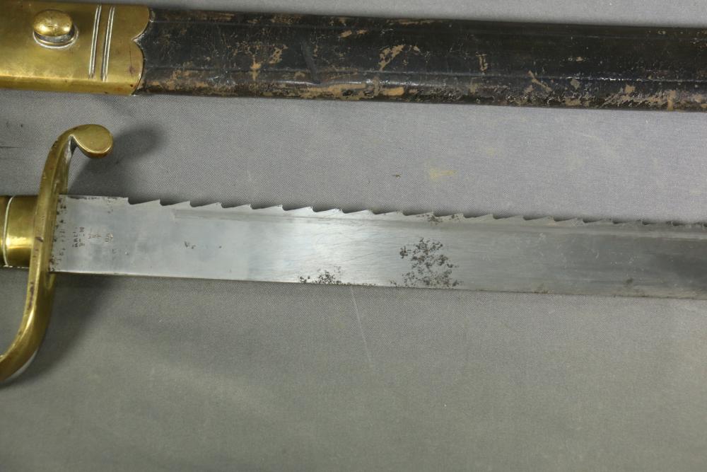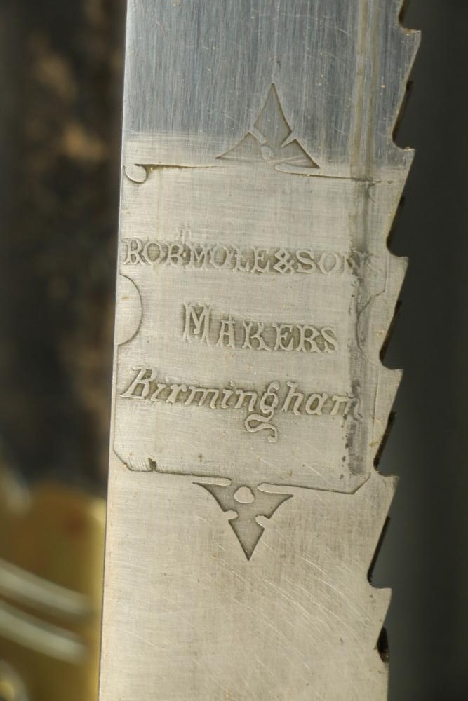 Robert Mole & Sons pioneers short sword with saw back blade in scabbard marked on ricasso "3/93", and on reverse an arrow over "WD" over a crown over "B" over "25, over "Mole Birmm", blade marked "Rob Mole & Sons Makers Birmingham", cross guard marked with the letter "N", pommel side of handle having crows feet style decoration, scabbard marked on upper brass portion with a crown over "43" over "W", length of sword without scabbard 27.75"L.
