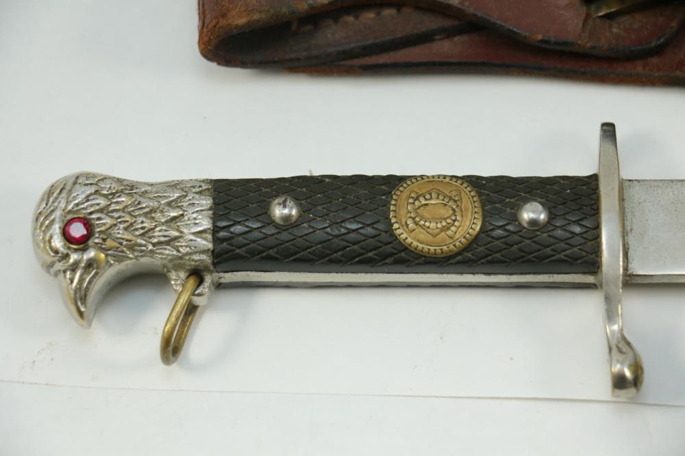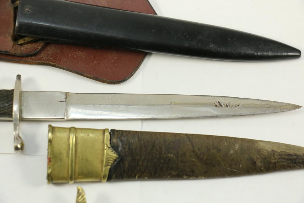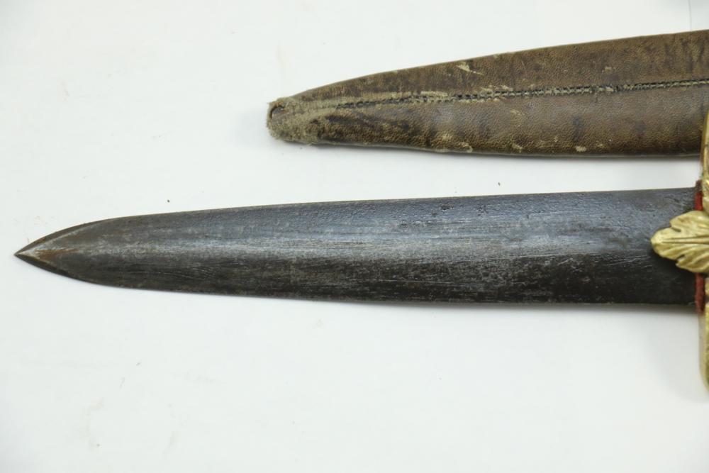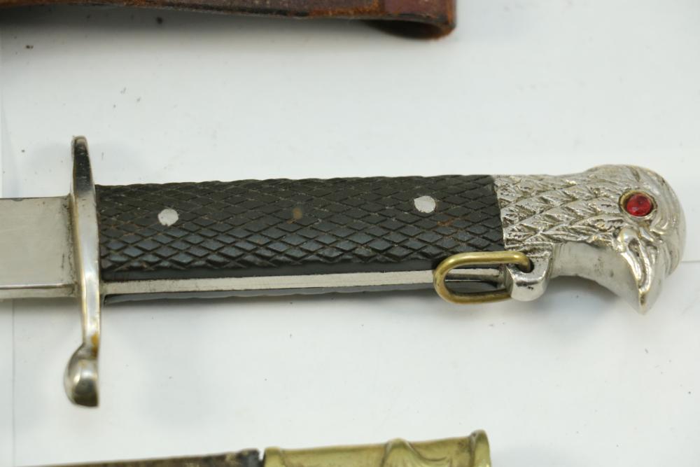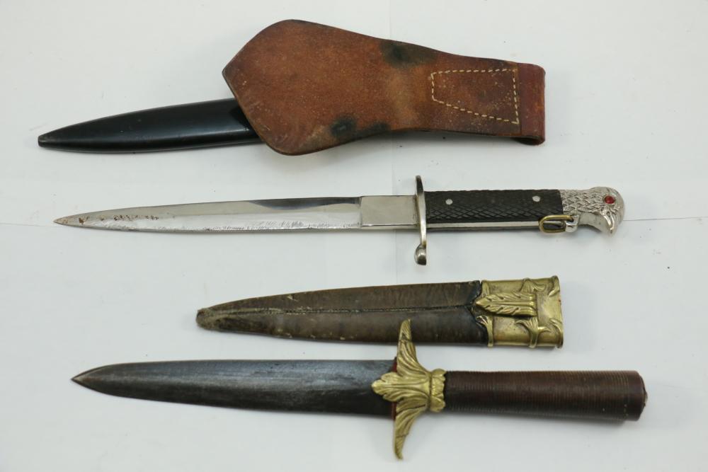 Two unidentified knives both in scabbards one with brass cross guard and flower shaped pommel scabbard having brass accents length without scabbard 10"L, second having eagle pommel with red glass eyes, applied interlocking "C" design on handle, length of dagger without scabbard 10.5"L.