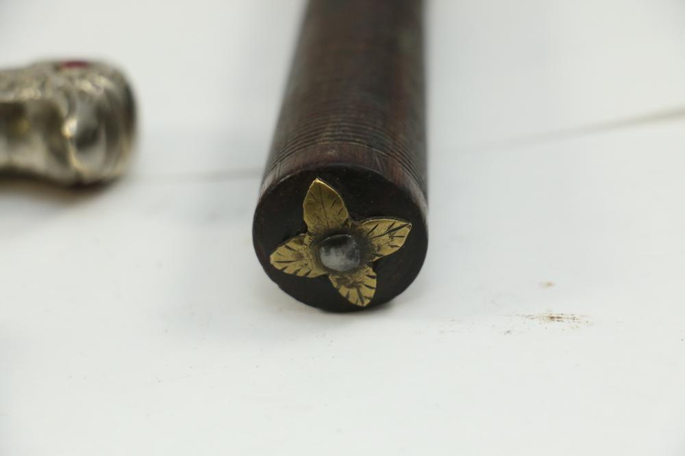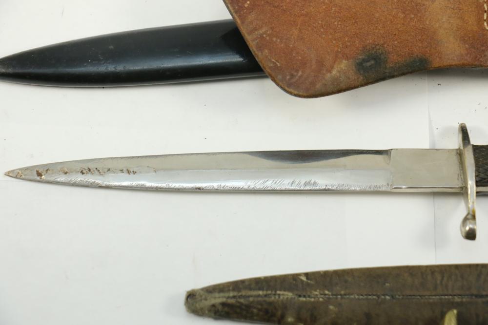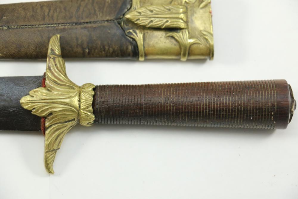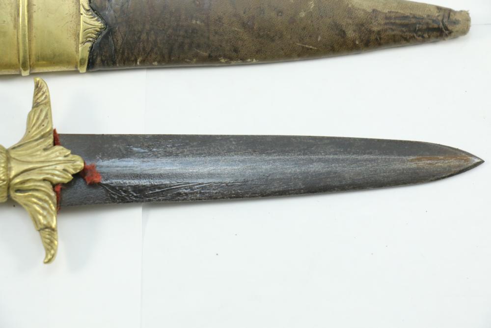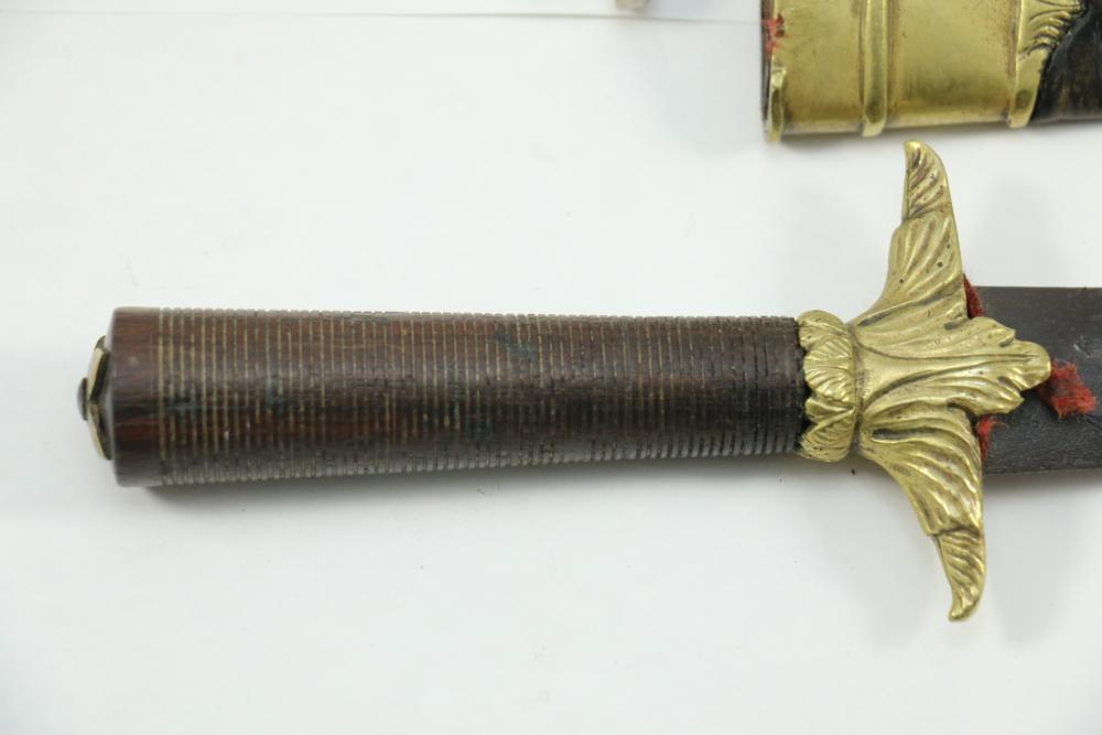Two unidentified knives both in scabbards one with brass cross guard and flower shaped pommel scabbard having brass accents length without scabbard 10"L, second having eagle pommel with red glass eyes, applied interlocking "C" design on handle, length of dagger without scabbard 10.5"L.